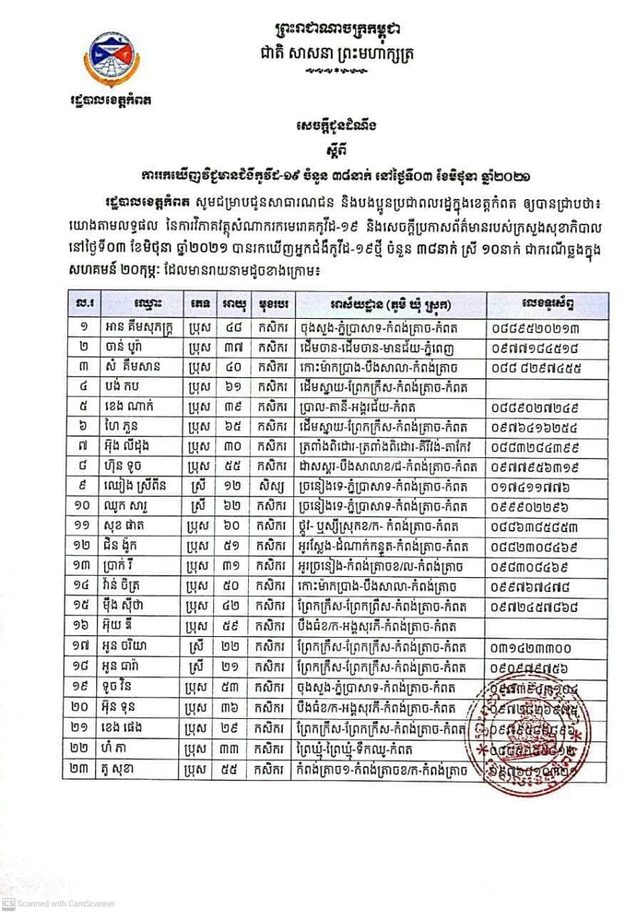អាជ្ញាធរខេត្តកំពត ប្រកាសថារកឃើញករណីវិជ្ជមានកូវីដ-១៩ ចំនួន ៣៨ករណី បន្ថែមទៀត