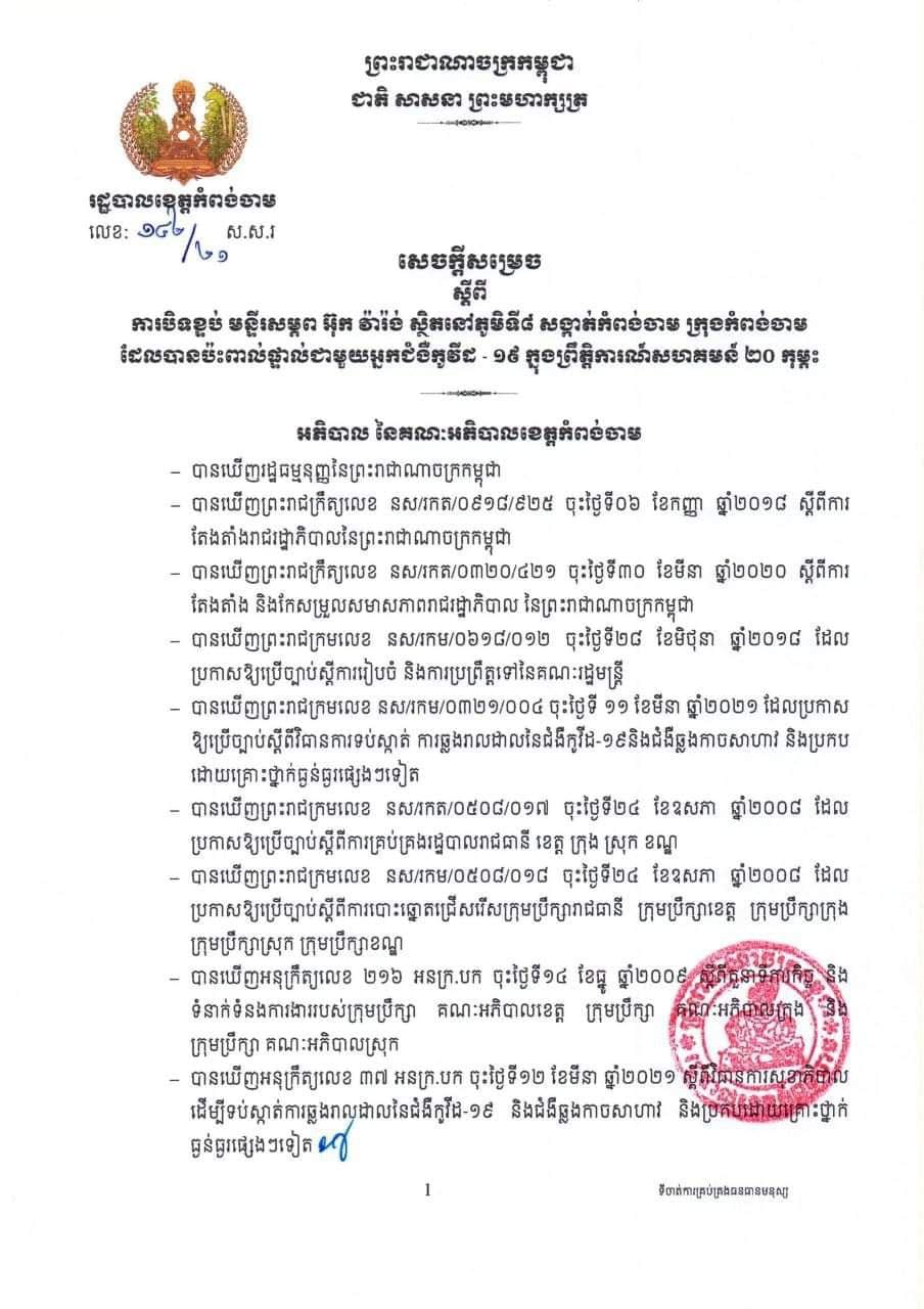 រដ្ឋបាលខេត្តកំពង់ចាម បានចេញសេចក្តីសម្រេច ស្ដីពីការបិទខ្ទប់ មន្ទីរសម្ភព អ៊ុក វ៉ារ៉ង់ ស្ថិតនៅភូមិទី៨ សង្កាត់កំពង់ចាម ក្រុងកំពង់ចាម ដែលបានប៉ះពាល់ផ្ទាល់ជាមួយអ្នកជំងឺកូវីដ១៩ ក្នុងព្រឹត្តិការណ៍ សហគមន៍ ២០-កុម្ភៈ រយៈពេល ១៤ថ្ងៃ គិតចាប់ពីថ្ងៃទី០៤ ដល់ថ្ងៃទី១៦ ខែមិថុនា ឆ្នាំ២០២១ ។