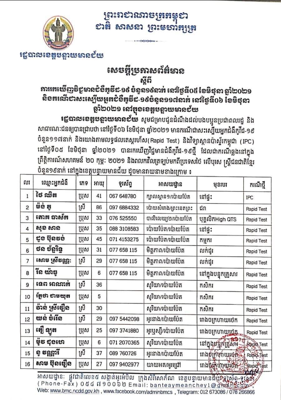 ខេត្តបន្ទាយមានជ័យ បន្តរកឃើញអ្នកវិជ្ជមានកូវីដ១៩ ចំនួន ១៩នាក់ និងជាសះស្បើយចំនួន ១១៧នាក់