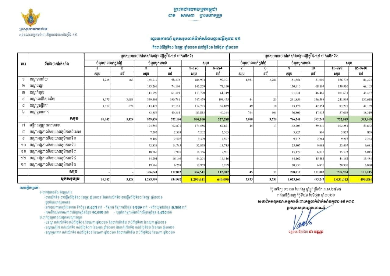 ក្រសួងការពារជាតិកម្ពុជា ចេញផ្សាយរបាយការណ៍ស្តីពីការចាក់វ៉ាកសាំងការបារកូវីដ-១៩ នៅថ្ងៃទី០៦ ខែមិថុនា ឆ្នាំ២០២១ ដោយបានឲ្យដឹងថា ការចាក់វ៉ាក់សាំងការពារជំងឺកូវីដ១៩ លើកទី១ ជូនកងទ័ព, គ្រួសារកងទ័ព និងប្រជាពលរដ្ឋ បានចំនួនសរុប ១,២៩៦,៦៤១នាក់ ក្នុងនោះចាក់នៅតំបន់ក្រហមបានចំនួន ៩៩០,១០០នាក់ ខណៈចាក់លើកទី២ បានចំនួន ១,០៣១,០១៣នាក់។