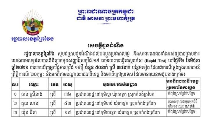 ខេត្តព្រៃវែង រកឃើញអ្នកឆ្លងជំងឺកូវីដ-១៩ថ្មី ចំនួន ៥០នាក់ ក្នុងរយៈពេល ២៤ម៉ោងចុងក្រោយ