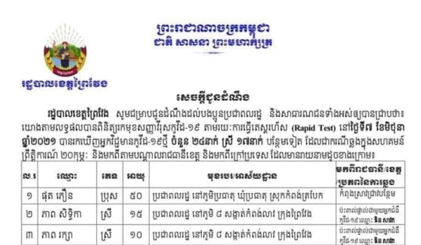 ខេត្តព្រៃវែង រកឃើញអ្នកឆ្លងជំងឺកូវីដ-១៩ ថ្មីចំនួន ២៤នាក់ ក្នុងរយៈពេល ២៤ម៉ោងចុងក្រោយ