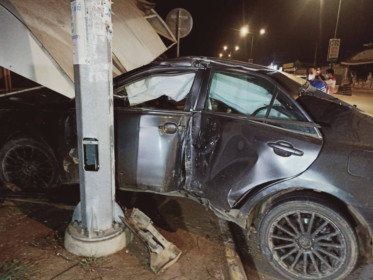 សង្ស័យស្រវឹងស្រា បុរសភេទទីបី ម្នាក់បើករថយន្ត camry មួយគ្រឿងក្នុងល្បឿនលឿនជ្រុលទៅបុកចំណតរថយន្តក្រុង និងបង្គោលភ្លើងស្តុបខូចខាតយ៉ាងដំណំ
