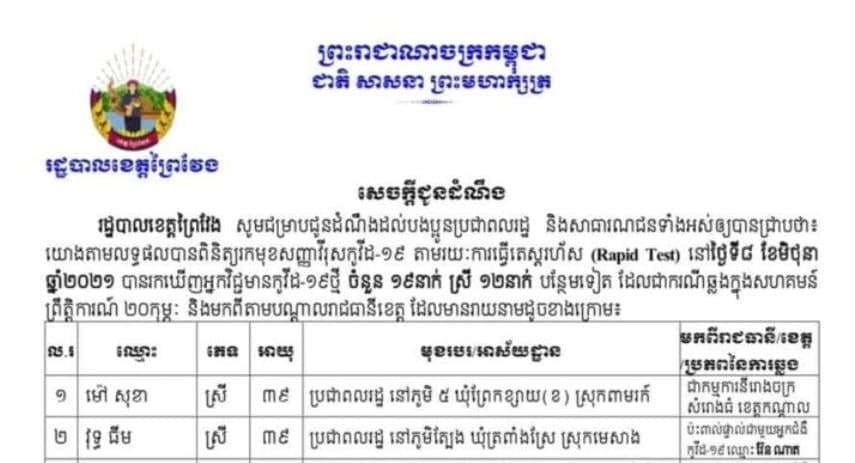 ខេត្តព្រៃវែង រកឃើញអ្នកឆ្លងជំងឺកូវីដ-១៩ ថ្មីចំនួន ១៩នាក់ ក្នុងរយៈពេល ២៤ម៉ោងចុងក្រោយ