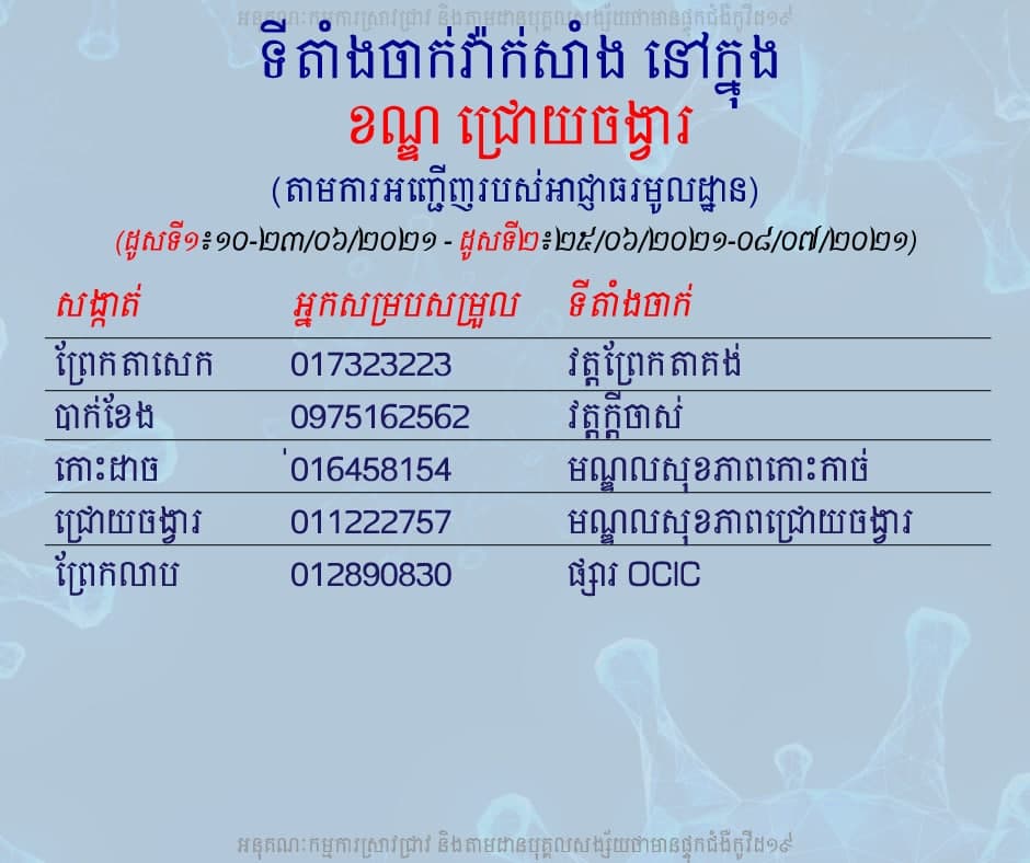 ប្រជាពលរដ្ឋ រស់នៅខណ្ឌជ្រោយចង្វារ អាចទៅចាក់វ៉ាក់សាំង ដូសទី១ ចាប់ពីថ្ងៃ១០ មិថុនា ដល់ថ្ងៃទី២៣ មិថុនា ២០២១ និងដូសទី២ ចាប់ពីថ្ងៃទី២៥ មិថុនា ដល់ថ្ងៃទី៨ កក្កដា ២០២១។ ចំពោះអ្នកដែលត្រូវទៅចាក់វ៉ាក់សាំង ត្រូវទៅជួបអាជ្ញាធរមូលដ្ឋានដើម្បីទទួលយកលិខិតអញ្ជើញជាមុនសិន។