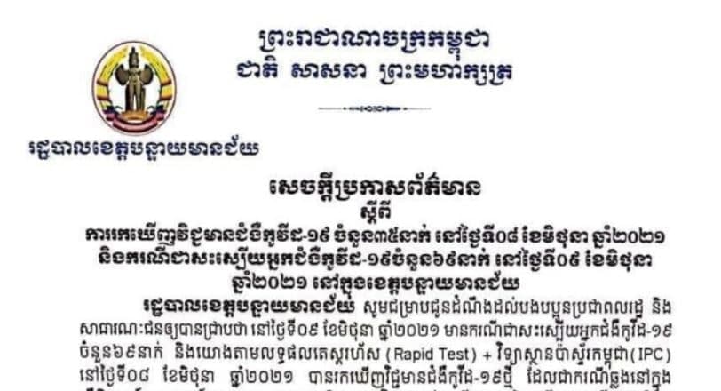 រដ្ឋបាលខេត្តបន្ទាយមានជ័យ បានអំពាវនាវដល់ ប្រជាពលរដ្ឋទាំងអស់ ដែលបានប៉ះពាល់ផ្ទាល់ និងប្រយោលជាមួយអ្នកជំងឺកូវីដ-១៩ទាំងនោះ ត្រូវប្រញាប់ធ្វើចត្តាឡីស័ក និងប្រញាប់ទំនាក់ទំនងទៅអាជ្ញារមូលដ្ឋាន ដើម្បីទៅធ្វើតេស្តរកមេរោគកូវីដ-១៩ នៅតាមមណ្ឌលសុខភាព ឬមន្ទីរពេទ្យបង្អែកដែលនៅជិតបំផុត។ ខេត្តបន្ទាយមានជ័យក៏បានជូនដំណឹងថា នៅថ្ងៃទី៨មិថុនាឆ្នាំ២០២១ មានអ្នកជាសះស្បើយពីជំងឺកូវីដ-១៩ចំនួន៦៩នាក់។