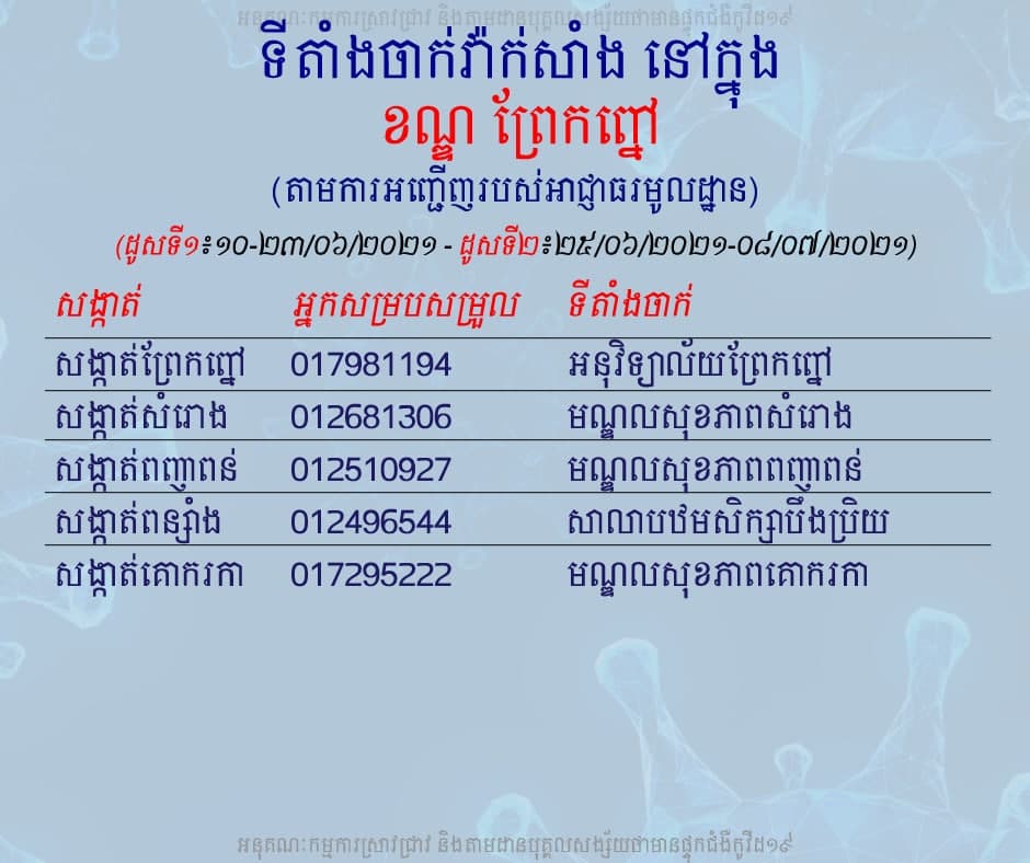 ប្រជាពលរដ្ឋ រស់នៅខណ្ឌព្រែកព្នៅ អាចទៅចាក់វ៉ាក់សាំង ដូសទី១ ចាប់ពីថ្ងៃ១០ មិថុនា ដល់ថ្ងៃទី២៣ មិថុនា ២០២១ និងដូសទី២ ចាប់ពីថ្ងៃទី២៥ មិថុនា ដល់ថ្ងៃទី៨ កក្កដា ២០២១។ ចំពោះអ្នកដែលត្រូវទៅចាក់វ៉ាក់សាំង ត្រូវទៅជួបអាជ្ញាធរមូលដ្ឋានដើម្បីទទួលយកលិខិតអញ្ជើញជាមុនសិន។