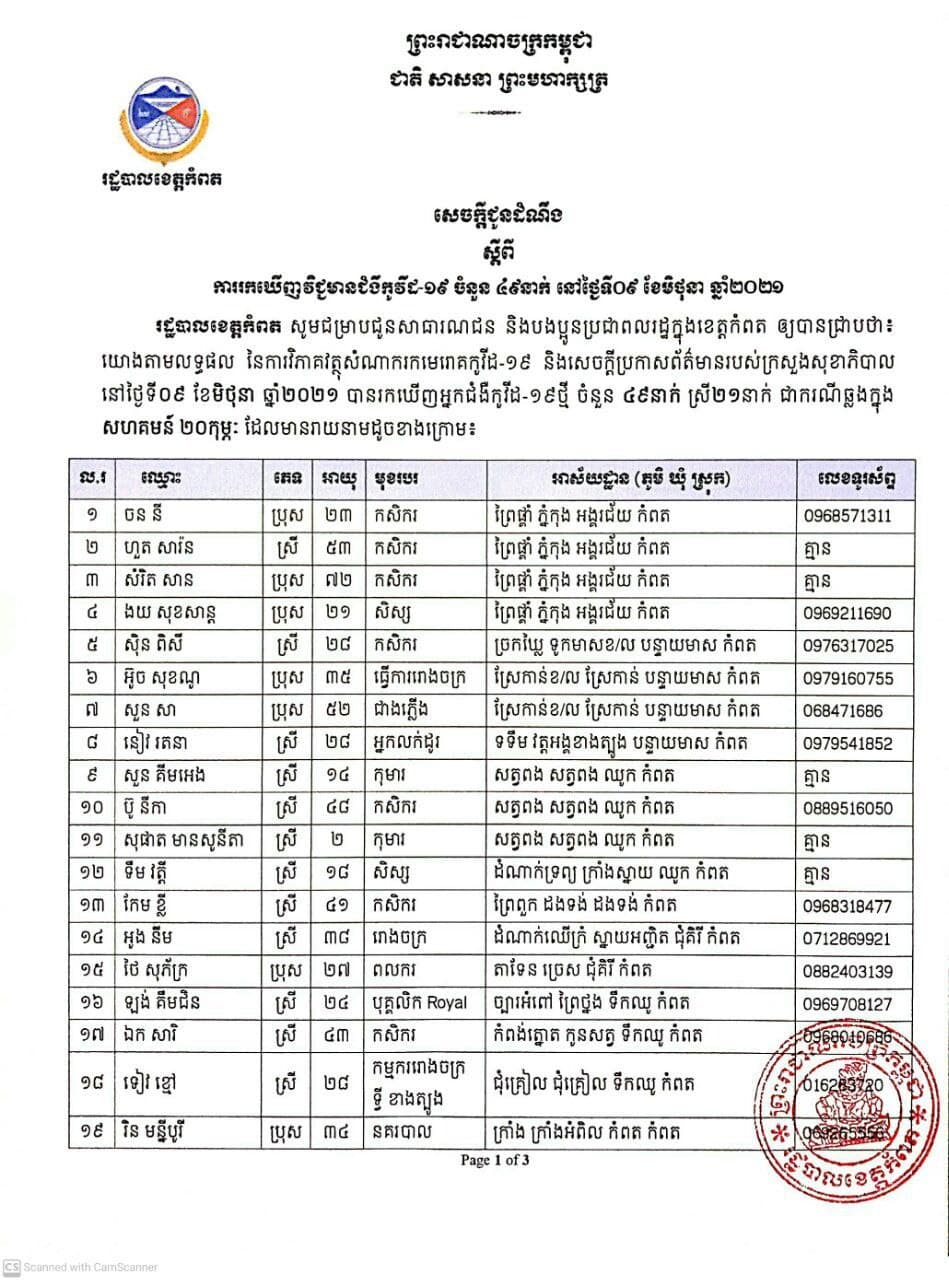 រដ្ឋបាលខេត្តកំពត រកឃើញករណីវិជ្ជមានកូវីដ-១៩ ថ្មីចំនួន ៤៩ករណីបន្ថែមទៀត