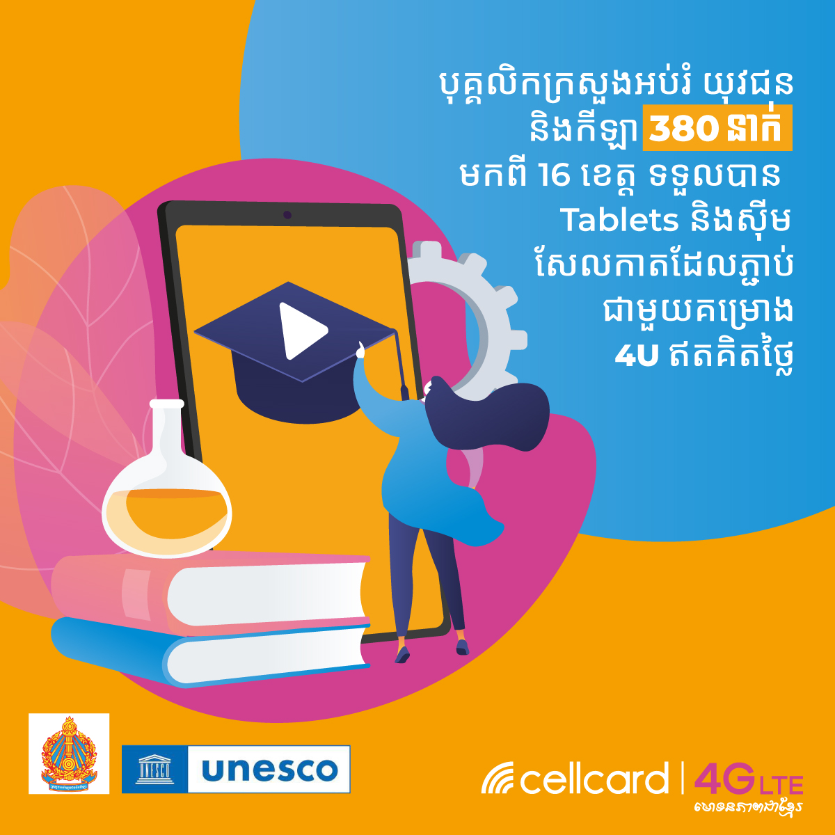 រាជធានីភ្នំពេញ៖គ្រូឧទ្ទេស និងគណៈគ្រប់គ្រងសាលាគរុកោសល្យ និងវិក្រឹតការខេត្តទាំង១៦ និងបុគ្គលិកអប់រំក្រសួងអប់រំ យុវជន និងកីឡា សរុបចំនួន ៣៨០នាក់ ទទួលបាន Tablet ថ្មីជាមួយនឹងស៊ីមកាត និងទិន្នន័យអ៊ីនធឺណែតប្រើបាស់ដោយឥតគិតថ្លៃ តាមរយៈកិច្ចសហការរវាងក្រសួងអប់រំ យុវជន និងកីឡា អង្គការយូណេស្កូ និងក្រុមហ៊ុនសែលកាត។