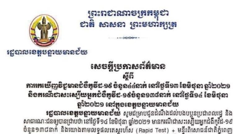 អាជ្ញាធរខេត្តបន្ទាយមានជ័យ នៅថ្ងៃ ១៤មិថុនា បានជូនដំណឹងថា គេបានបន្តរកឃើញអ្នកឆ្លងជំងឺកូវីដ-១៩ ចំនួន ៤៤នាក់នៅថ្ងៃទី ១៣មិថុនា ។ ក្នុងចំណោមអ្នកកឆ្លងថ្មីទាំងនោះ មានករណីឆ្លងសហគមន៍ចំនួន២៥នាក់, និងកម្មករមកពីប្រទេសថៃចំនួន១៩នាក់។ រដ្ឋបាលខេត្តបន្ទាយមានជ័យ បានអំពាវនាវដល់ ប្រជាពលរដ្ឋទាំងអស់ ដែលបានប៉ះពាល់ផ្ទាល់ និងប្រយោលជាមួយអ្នកជំងឺកូវីដ-១៩ទាំងនោះ ត្រូវប្រញាប់ធ្វើចត្តាឡីស័ក និងប្រញាប់ទំនាក់ទំនងទៅអាជ្ញារមូលដ្ឋាន ដើម្បីទៅធ្វើតេស្តរកមេរោគកូវីដ-១៩ នៅតាមមណ្ឌលសុខភាព ឬមន្ទីរពេទ្យបង្អែកដែលនៅជិតបំផុត។ ខេត្តបន្ទាយមានជ័យក៏បានជូនដំណឹងថា នៅថ្ងៃទី១៣មិថុនាឆ្នាំ២០២១ មានអ្នកជាសះស្បើយពីជំងឺកូវីដ-១៩ចំនួន១៣៨នាក់។