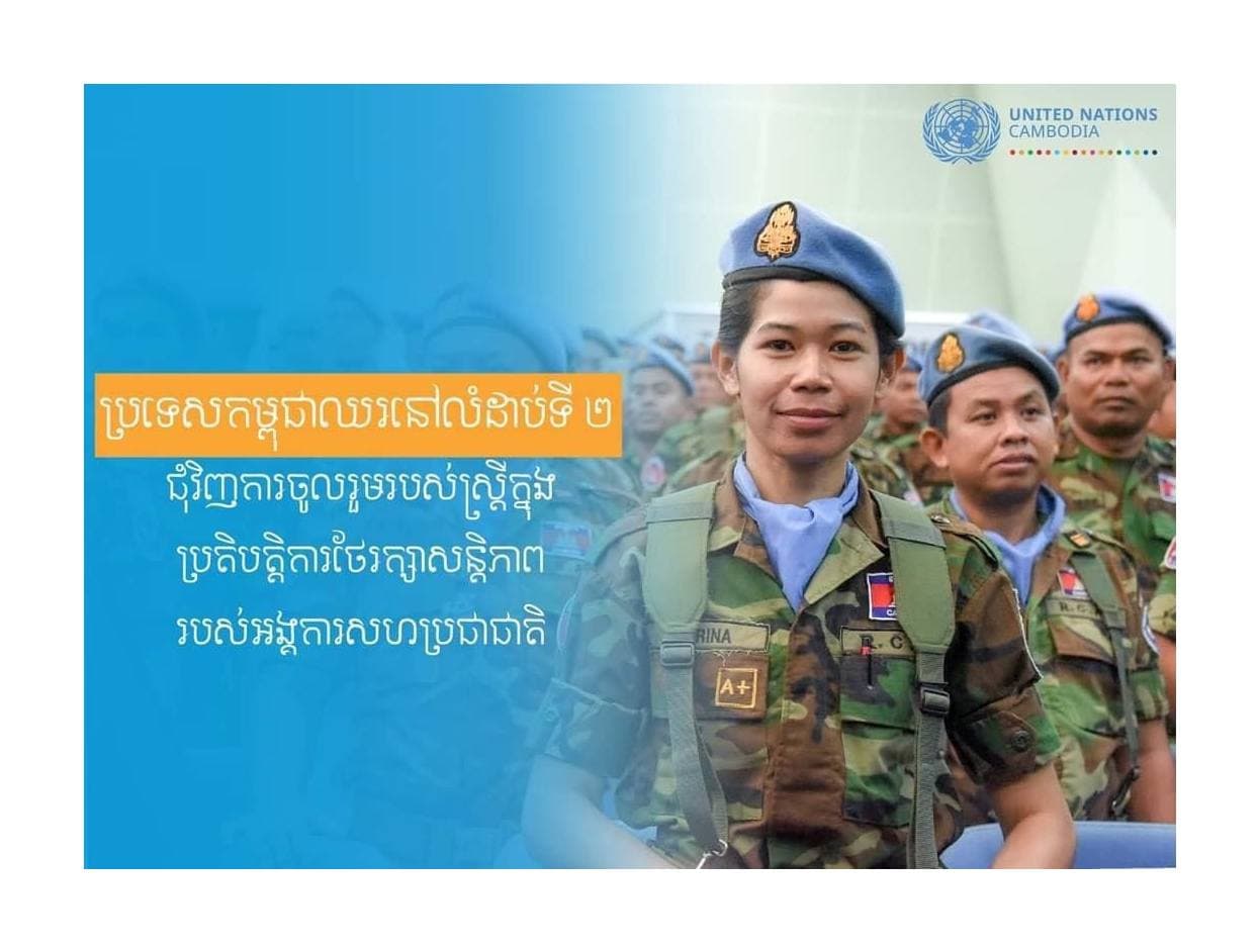 ប្រទេសកម្ពុជាឈរនៅលំដាប់ទី២ ជុំវិញការចូលរួមរបស់ស្ដ្រី ក្នុងប្រតិបត្តិការថែរក្សាសន្តិភាព របស់អង្គការសហប្រជាជាតិOne-Minuteអត្ថបទដោយ៖AMS OneMinute 👏🇰🇭🇺🇳 📷 កងកម្លាំងរក្សាសន្តិភាពជូនពិភពលោក AMS OneMinuteអត្ថបទមុនអត្ថបទបន្ទាប់