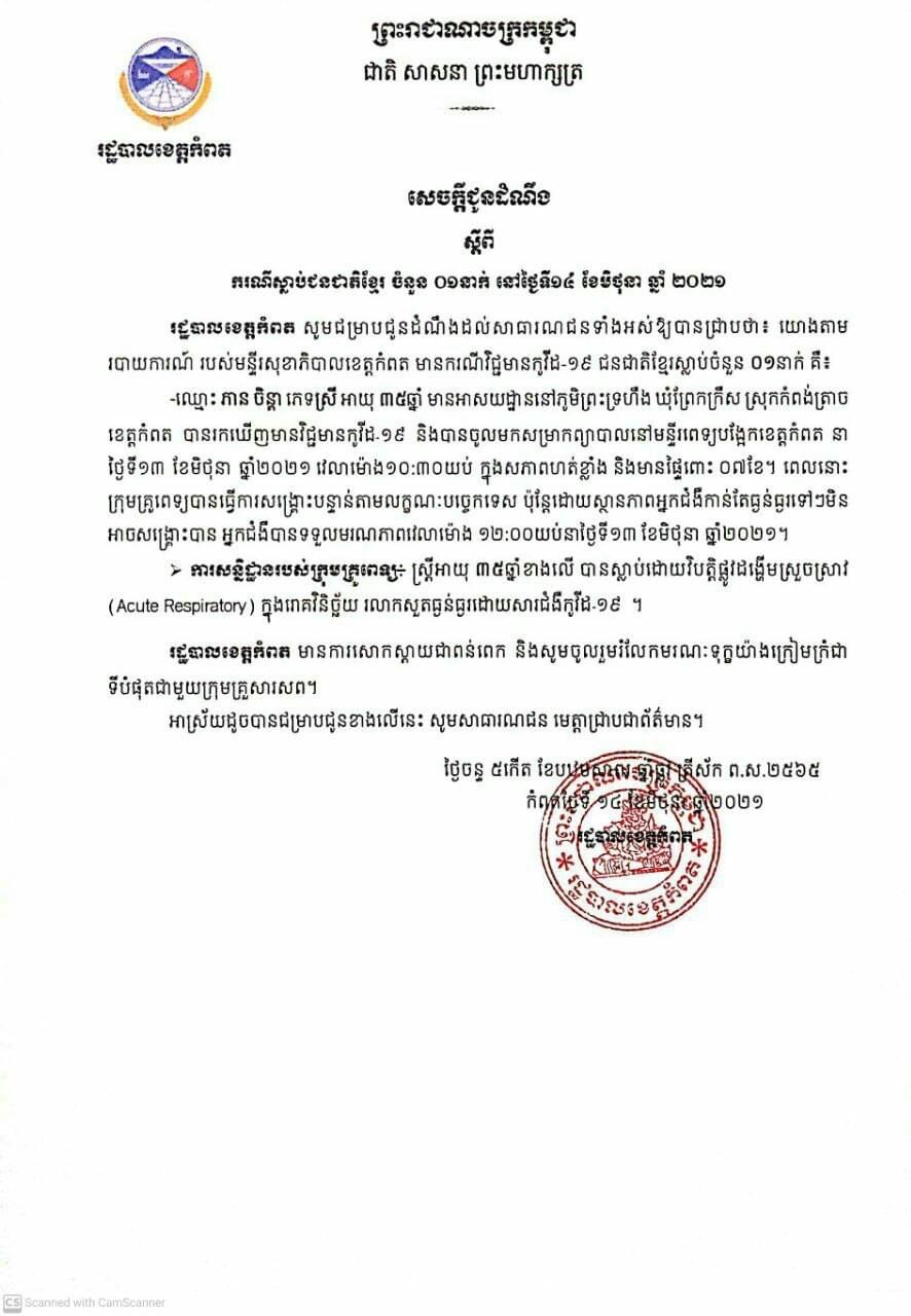 ស្រ្តីមានផ្ទៃពោះ៧ខែ នៅខេត្តកំពត បានស្លាប់ដោយសារជំងឺកូវីដ-១៩