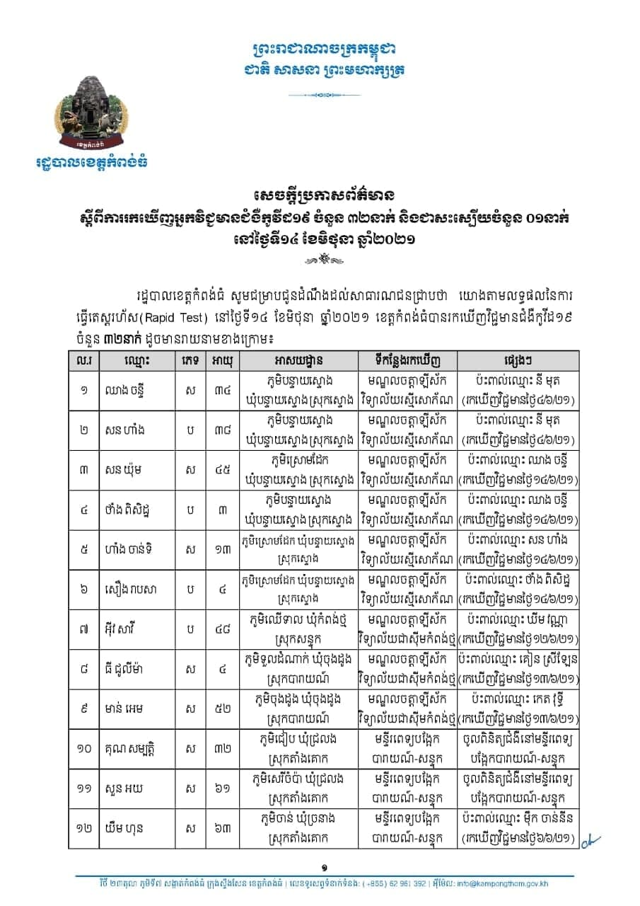សេចក្តីប្រកាសព័ត៌មានរបស់រដ្ឋបាលខេត្តកំពង់ធំ ស្តីពីការរកឃើញ អ្នកវិជ្ជមាន ជំងឺកូវីដ១៩ ចំនួន ៣២នាក់