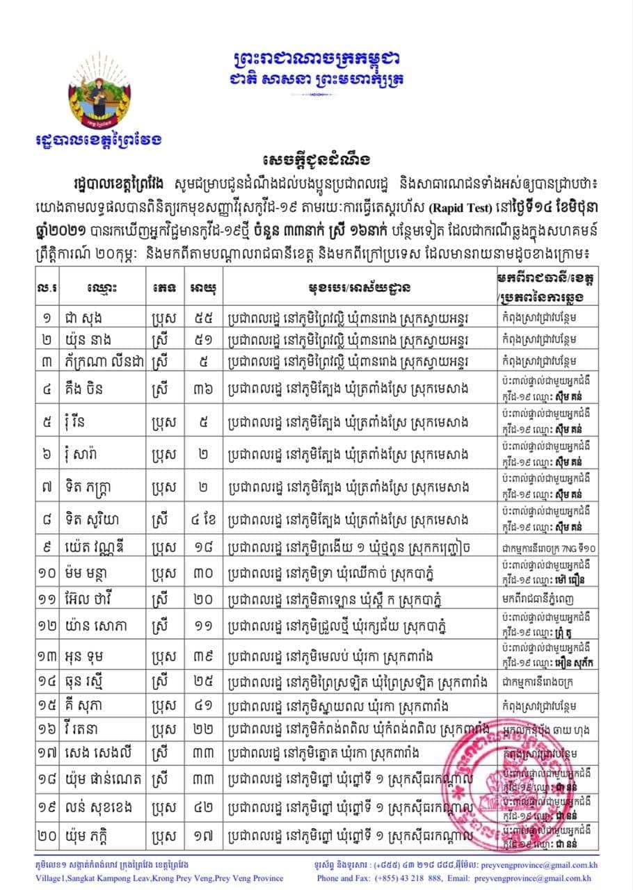 ខេត្តព្រៃវែងរកឃើញអ្នកឆ្លងជំងឺកូវីដ-១៩ថ្មីចំនួន៣៣នាក់ ក្នុងរយៈពេល២៤ម៉ោងចុងក្រោយ