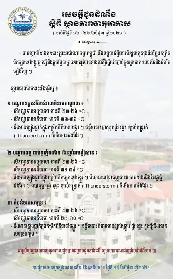 យោងតាមការព្យាករណ៍របស់ក្រសួងធនធានទឹក និងឧតុនិយមនៅថ្ងៃទី១៥មិថុនានេះ បានឲ្យដឹងថា នាសប្ដាហ៏ខាងមុខពោលគឺចាប់ពីថ្ងៃទី១៦ដល់ថ្ងៃទី២២មិថុនាឆ្នាំ២០២១ ប្រទេសកម្ពុជានឹងទទួលឥទ្ធិពលពីខ្យល់មូសុងនិរតីក្នុងកម្រិតពីមធ្យមទៅបង្គួរគួបផ្សំនឹងប្រពន្ធ័សម្ពាធទាបនៅភាគខាងលើ។ ស្ថានភាពបែបនោះនឹងធ្វើឲ្យបណ្ដាខេត្តនៅតំបន់ទំនាបកណ្ដាល អាចនឹងមានភ្លៀងធ្លាក់ក្នុងកម្រិតពីតិចទៅបង្គួរ។ ទន្ទឹមនឹងនោះ បាតុភូតផ្គរ រន្ទះ ខ្យល់កន្ត្រាក់ ក៍អាចកើតមានផងដែរ។ នៅបណ្ដាខេត្ត ជាប់ជួរភ្នំដងរែក និងខ្ពង់រាបឦសានវិញ អាចនឹងមានភ្លៀងធ្លាក់ក្នុងកម្រិតពីមធ្យមទៅបង្គួរ ជាពិសេសនៅភាគឦសាន ភាគខាងជើងនៃជួរភ្នំដងរែក។ ឯបាតុភូតផ្គរ រន្ទះ ខ្យល់កន្ត្រាក់ ក៍អាចកើតមានផងដែរ។ ចំណែកនៅតំបន់មាត់សមុទ្រវិញ អាចនឹងមានភ្លៀងធ្លាក់ក្នុងកម្រិតពីតិចទៅបង្គួរ។ ទន្ទឹមនឹងនោះ ក៏អាចមានខ្យល់ ភ្លៀង ផ្គរ រន្ទះ គួបផ្សំនិងរលកសមុទ្រមធ្យមផងដែរ។