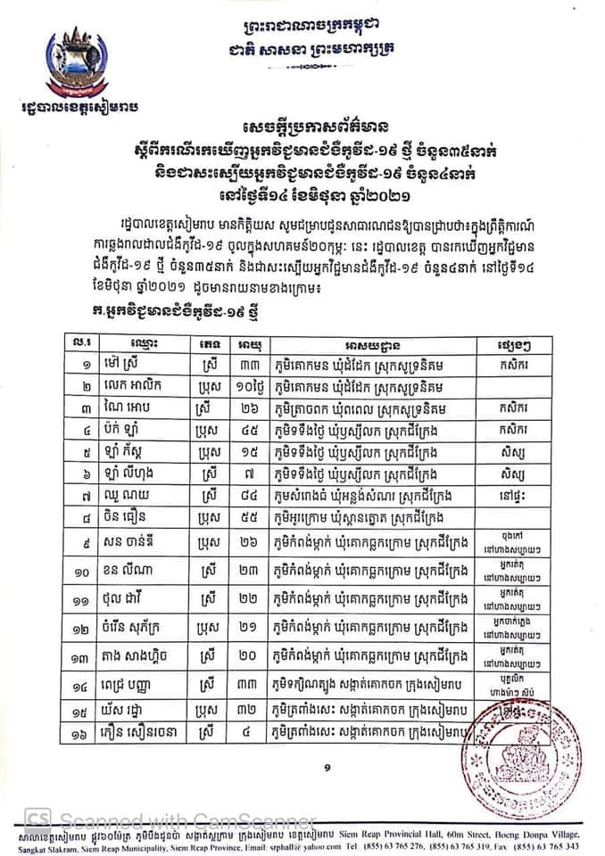 រដ្ឋបាលខេត្តសៀមរាប បានជូនដំណឹងថា រដ្ឋបាលខេត្ត បានរកឃើញអ្នកវិជ្ជមានជំងឺកូវីដ-១៩ ថ្មី ចំនួន៣៥នាក់ នៅថ្ងៃទី១៤មិថុនា ឆ្នាំ២០២១។ ក្នុងចំណោមអ្នកឆ្លងថ្មីទាំងនោះ មានអ្នកពីប្រទេសថៃចំនួន១៧នាក់ និង១៨នាក់ទៀត ជាករណីឆ្លងក្នុងសហគមន៍ មាននៅ ស្រុកសូទ្រនិគមចំនួន៣នាក់, ស្រុកជីក្រែង១០នាក់, ក្រុងសៀមរាបចំនួន៣នាក់, ស្រុកប្រាសាទបាគងម្នាក់, និងមកពីខេត្តកំពង់ធំម្នាក់។ រដ្ឋបាលខេត្តសៀមរាប បានអំពាវនាវឲ្យប្រជាពលរដ្ឋ ដែលបានពាក់ព័ន្ធដោយផ្ទាល់ ឬដោយប្រយោល ជាមួយអ្នកវិជ្ជមានខាងលើ សូមរួសរាន់ធ្វើចត្តាឡីស័កតាមផ្ទះក្នុងក្រុមគ្រួសាររៀងៗខ្លួនឱ្យបានគ្រប់១៤ថ្ងៃ ដោយមិនត្រូវពាក់ព័ន្ធ និងប៉ះពាល់ជាមួយអ្នកដទៃជាដាច់ខាត ក្នុងករណីមិនអនុវត្តកាតព្វកិច្ចចត្តាឡីស័ក រដ្ឋបាលខេត្តនឹងចាត់វិធានការផ្លូវច្បាប់ចំពោះបុគ្គលទាំងឡាយណាដែលលើ្មសនឹងវិធានសុខាភិបាលនោះ។ ប្រសិនបើមានការប្រែប្រួលសុខភាព ត្រូវផ្តល់ព័ត៌មានទៅអាជ្ញាធរមូលដ្ឋានជាបន្ទាន់ ដើម្បីក្រុមការងារចាត់វិធានការក្នុងការយកសំណាកធ្វើតេស្តស្រាវជ្រាវ។ ជាមួយគ្នានោះ នៅថ្ងៃទី១៤មិថុនា មានអ្នកជាសះស្បើយ៤នាក់ហើយ ក្រុមគ្រូពេទ្យបានអនុញ្ញាតឱ្យចេញពីមន្ទីរពេទ្យបង្អែកខេត្ត ត្រឡប់ទៅលំនៅឋានវិញ ដោយត្រូវបន្តការធ្វើចត្តាឡីស័ករយៈពេល១៤ថ្ងៃ។ មកទល់នឹងថ្ងៃទី១៤មិថុនាឆ្នាំ២០២១ ខេត្តសៀមរាប មានអ្នកវិជ្ជមានជំងឺកូវីដ-១៩ ចំនួន៤៩៤នាក់ បានព្យាបាលជាសះស្បើយចំនួន១១៧នាក់ ស្លាប់៣នាក់ និង៣៧៤នាក់ កំពុងសម្រាកព្យាបាលនៅមន្ទីរពេទ្យបង្អែកខេត្តសៀមរាប និងទីតាំងមួយចំនួនទៀត។