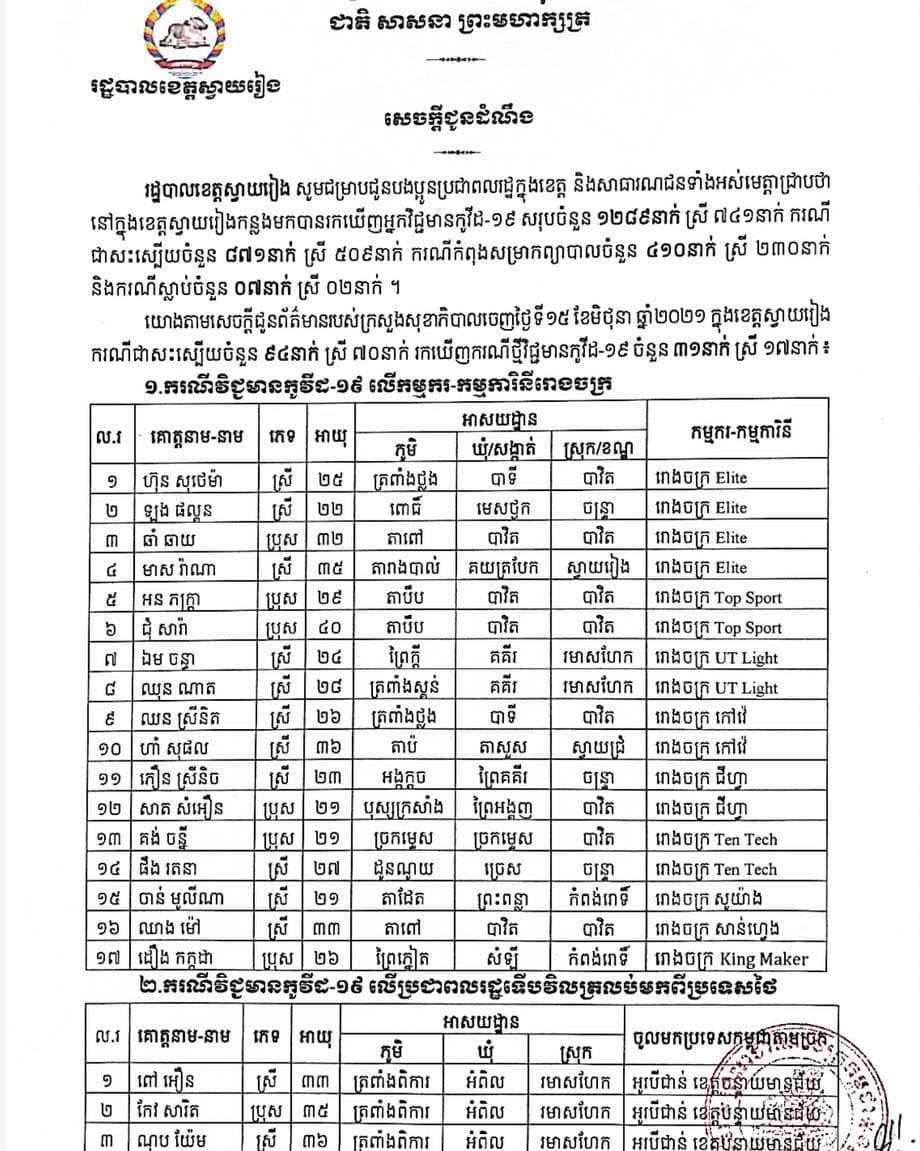 យោងតាមសេចក្ដីជូនដំណឹងរបស់រដ្ឋបាលខេត្តស្វាយរៀង បានឲ្យដឹងថា នៅថ្ងៃទី១៤មិថុនា រដ្ឋបាលខេត្ត បានរកឃើញករណីវិជ្ជមានវីរុសកូវីដ-១៩ លើចំនួន៣១នាក់។ អ្នកឆ្លងទាំងនោះ រួមមាន១៧នាក់ជាកម្មករ កម្មការិនីនៅរោងចក្រ នានា, ៦នាក់មកពីប្រទេសថៃ, ក្រុងស្វាយរៀង២នាក់, ក្រុងបាវិតម្នាក់, ស្រុករមាសហែកម្នាក់, ស្រុកចន្ទ្រាម្នាក់, ស្រុកស្វាយទាម្នាក់, ស្រុកស្វាយជ្រំម្នាក់ និងទៅពីរាជធានីភ្នំពេញម្នាក់។ រដ្ឋបាលខេត្តស្វាយរៀង បានអំពាវនាវដល់អ្នកដែលមានពាក់ពន្ធ័ ឬដឹងខ្លួនថាបានប៉ះពាល់ដោយផ្ទាល់ ឬដោយប្រយោលជាមួយអ្នកវិជ្ជមានកូវីដ-១៩ទាំងនោះ ត្រូវធ្វើចត្តាឡីស័កនៅតាមផ្ទះរយៈពេល១៤ថ្ងៃ។ ប្រសិនបើមានបញ្ហាសុខភាពប្រែប្រួល ត្រូវផ្ដល់ព័ត៌មានទៅកាន់ទូរសព្ទ័លេខ ០៩៧ ៥០៣ ៤៥៦៧ ឬ០៤៤ ៧១២ ៥២២។ ខេត្តស្វាយរៀងគិតមកទល់ថ្ងៃទី១៤មិថុនាឆ្នាំ២០២១ មានអ្នកឆ្លងជំងឺកូវីដ-១៩សរុបចំនួន១ពាន់២៨៩នាក់, ព្យបាលជាសះស្បើយចំនួន៨៧១នាក់, កំពុងសម្រាកព្យាបាលចំនួន៤១០នាក់ និងមានអ្នកស្លាប់ចំនួន៧នាក់។