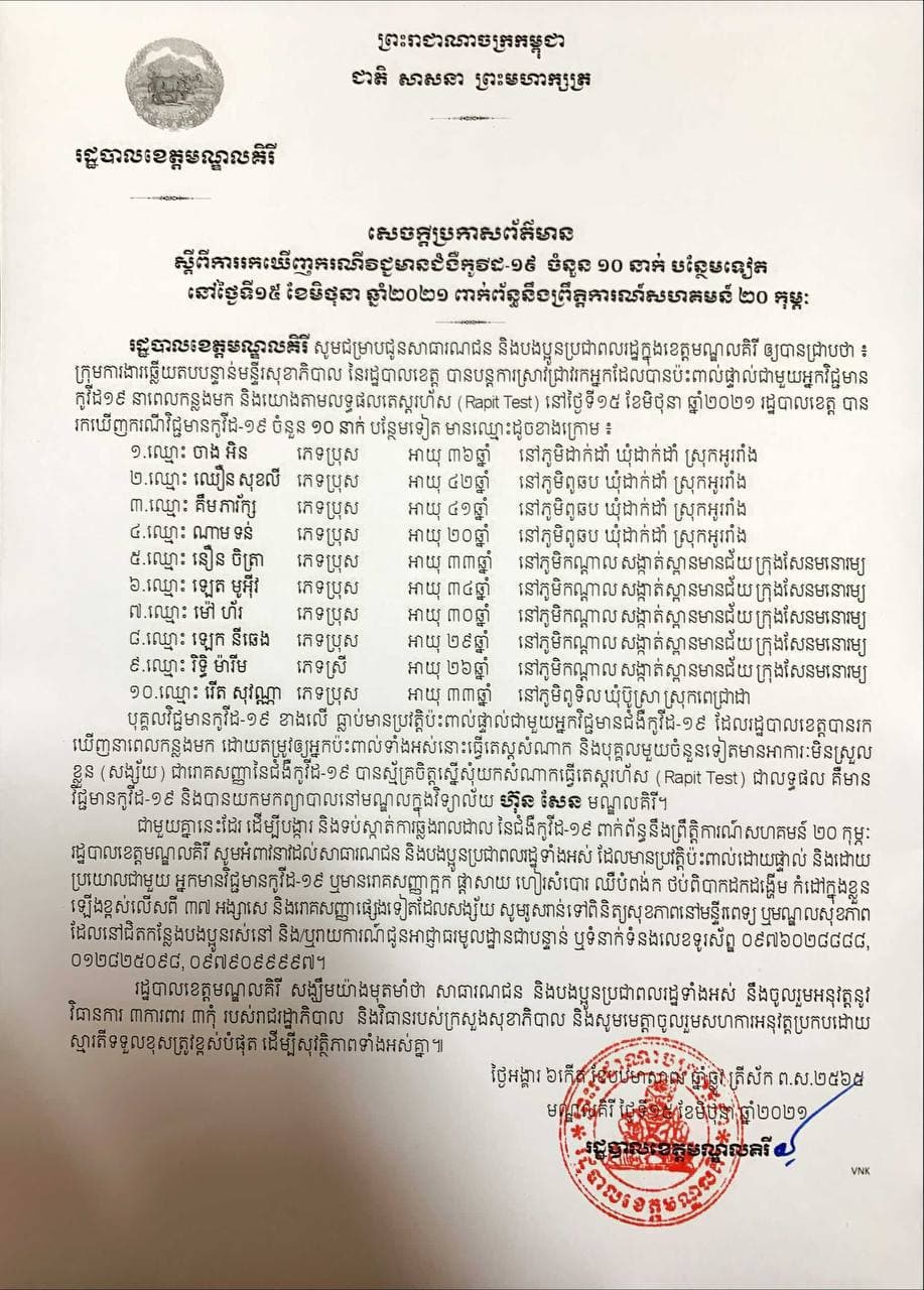 អត្តសញ្ញាណអ្នកវិជ្ជមានកូវីដ១៩ចំនួន ១០នាក់ នៅខេត្តមណ្ឌលគិរីOne-Minuteអត្ថបទដោយ៖AMS OneMinute ១៥ មិថុនា ២០២១ AMS OneMinuteអត្ថបទមុនអត្ថបទបន្ទាប់