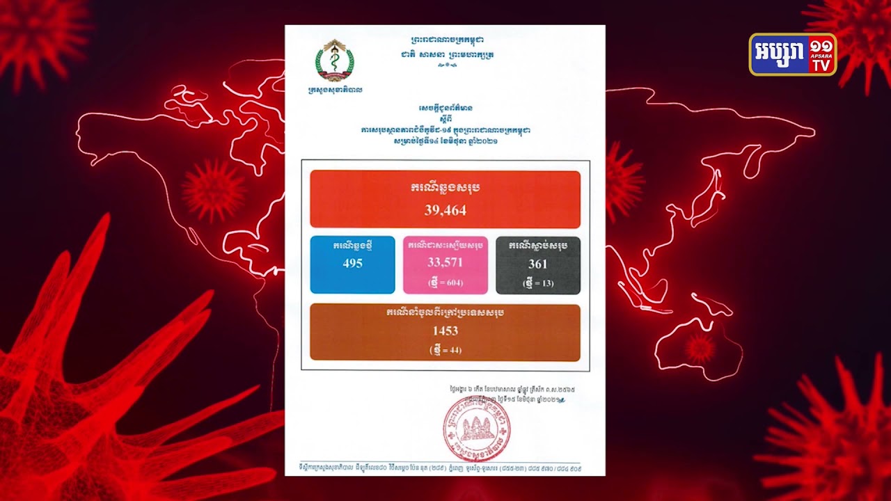 កម្ពុជាគិតត្រឹមថ្ងៃទី១៥ខែមិថុនាឆ្នាំ២០២១ ការឆ្លងសរុបទូទាំងប្រទេសចំនួន៣ម៉ឺន ៩ពាន់៤៦៤នាក់, ការស្លាប់សារុបមានចំនួន៣៦១នាក់ក្រោយការស្លាប់ថ្មីចំនួន១៣នាក់ក្នុងរយ:ពេល២៤កន្លង មកនេះ, និងការព្យាបាលជាសះស្បើយសារុបមានចំនួន៣ម៉ឺន៣ពាន់៥៧១នាក់ក្រោយការព្យាបាលជាសះ ស្បើយចំនួន៦០៤នាក់ក្នុងរយ:ពេល២៤ម៉ោងកន្លងមកនេះផងដែរ។