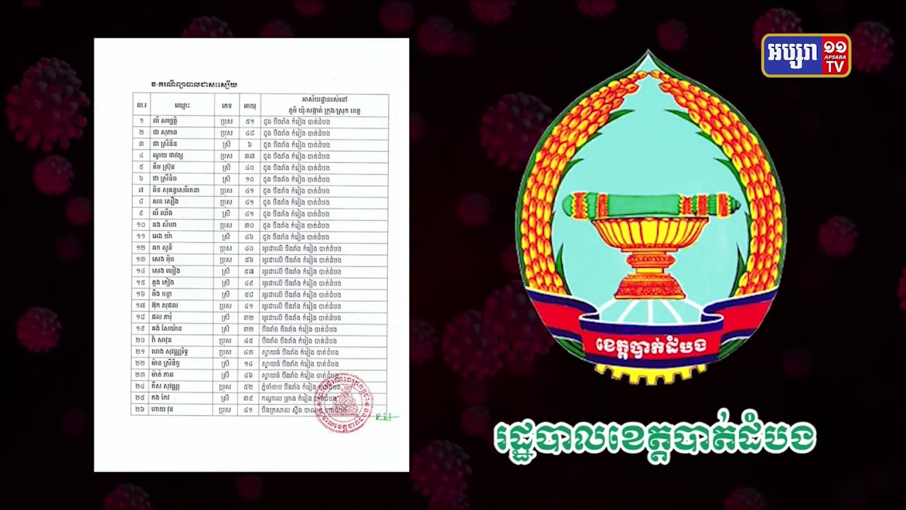 ខេត្តបាត់ដំបង មានអ្នកឆ្លងថ្មី១១នាក់ (Video Inside)ព័ត៌មានអប្សរាណេតអត្ថបទដោយ៖ឆាយ រត្ថា ឆាយ រត្ថាលោក ឆាយ រត្ថា ជាបុគ្គលិកផ្នែកព័ត៌មានវិទ្យា នៃអគ្គនាយកដ្ឋានវិទ្យុ និងទូរទស្សន៍ អប្សរាអត្ថបទមុនអត្ថបទបន្ទាប់