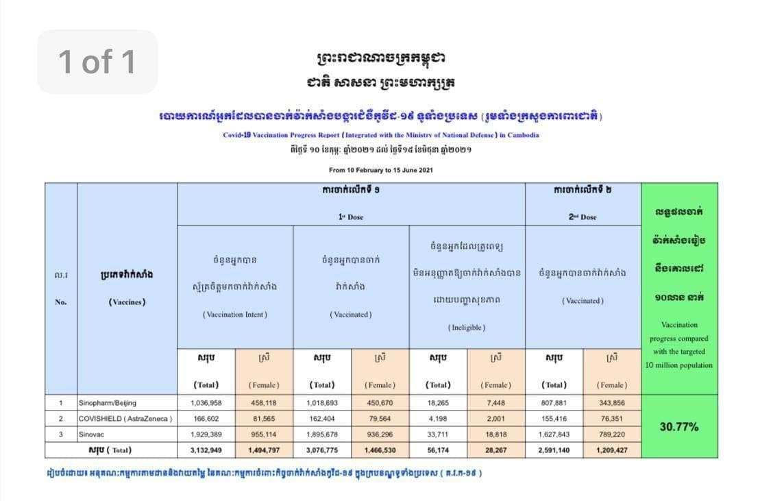 គិតត្រឹមថ្ងៃទី១៥ ខែមិថុនា ឆ្នាំ២០២១ ក្រសួងសុខាភិបាល និងក្រសួងការពារជាតិ បានចាក់វ៉ាក់សាំងការពារកូវីដ១៩ ជូនមន្រ្តីរាជការ ប្រជាពលរដ្ឋ និងកងកម្លាំងប្រដាប់អាវុធ នៅទូទាំងប្រទេសសរុបចំនួន ៣,០៧៦,៧៧៥នាក់។ សម្រាប់លទ្ធផលចាក់វ៉ាក់សាំងគោលដៅ១០លាននាក់ បានចំនួន៣០.៧៧%។