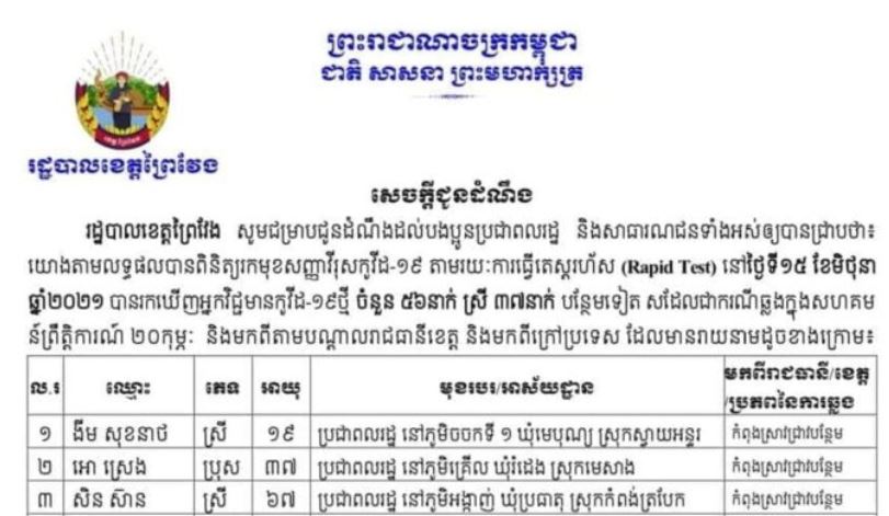 រដ្ឋបាលខេត្តព្រៃវែងបានបង្ហាញអត្តសញ្ញាណករណីអ្នកវិជ្ជមានកូវីដ-១៩ ចំនួន៥៦នាក់បន្ថែមទៀតតាមរយៈការធ្វើតេស្តរហ័ស (Rapid Test) នៅថ្ងៃទី១៥មិថុនាឆ្នាំ២០២១។ ក្នុងចំណោមអ្នកឆ្លងថ្មីទាំងនោះ មាននៅក្រុងព្រៃវែង៤នាក់, ស្រុកពាមរក៍៨នាក់, ស្រុកពារាំង៨នាក់, ស្រុកព្រះសេ្តច៨នាក់, ស្រុកកំពង់ត្របែក៧នាក់, ស្រុកពាមជរ៦នាក់, ស្រុកស្វាយអន្ទរ៥នាក់, ស្រុកមេសាង៥នាក់, ស្រុកកញ្ចៀចម្នាក់, ស្រុកពោធិ៍រៀងម្នាក់ និង មកពីខេត្តកណ្ដាលចំនួន៣នាក់។