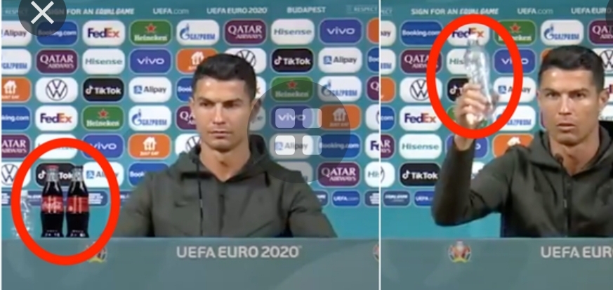 កីឡាករលំដាប់ពិភពលោក Cristiano Ronaldo បានដកភេសជ្ជៈកូកាកូឡាចេញពីមុខរបស់គាត់ ហើយលើកទឹកសុទ្ធជំនួសវិញ អំឡុងពេលធ្វើសន្និសីទសារព័ត៌មាន Euro 2020 កាលពីថ្ងៃចន្ទ ទី១៥ មិថុនា ២០២១ ធ្វើឲ្យក្រុមហ៊ុនកូកាកូឡា ខាតទឹកប្រាក់ ៤ពាន់លានដុល្លារអាមេរិក។