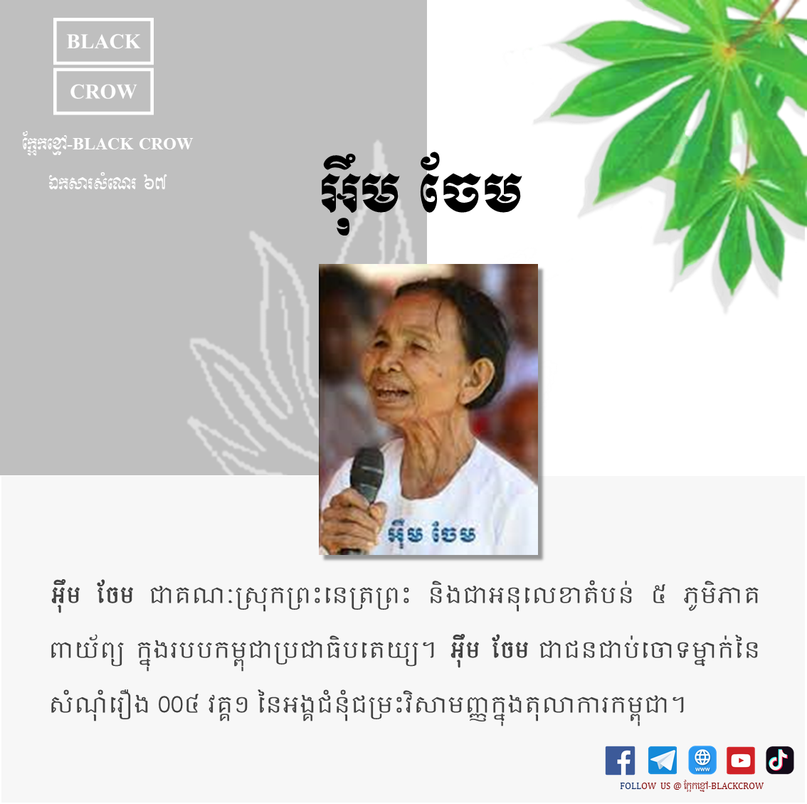 “អ៊ឹម ចែម” តួនាទីនៅក្នុងរបបកម្ពុជាប្រជាធិបតេយ្យ និងសំណុំរឿងនៅអង្គជំនុំជម្រះវិសាមញ្ញក្នុងតុលាការកម្ពុជាក្អែកខ្មៅឯកសារសំណេរអត្ថបទដោយ៖លី ប៊ុនហេង - Ly Bunheng #ក្អែកខ្មៅ #កម្ពុជាប្រជាធិបតេយ្យ #ប្រវត្ដិសាស្រ្ដកម្ពុជា #អ៊ឹមចែមFacebook Page: Black-Crow Telegram Channel លី ប៊ុនហេង - Ly Bunhengលី ប៊ុនហេង ប្រធានផ្នែកផ្សព្វផ្សាយ នៃសច្ចធម៌ប្រវត្តិសាស្រ្ដអត្ថបទមុនអត្ថបទបន្ទាប់