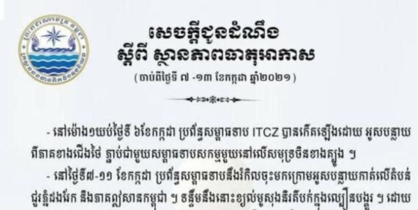 យោងតាមក្រសួងធនធានទឹក នៅថ្ងៃទី៦ កក្កដា ឆ្នាំ២០២១ បានឲ្យដឹងថា នៅម៉ោង ១យប់ថ្ងៃទី៦ កក្កដា ប្រព័ន្ធសម្ពាធទាប ITCZ បានកើតឡើងដោយអូសបន្លាយពីភាគខាងជើងប្រទេសថៃ ភ្ជាប់ជាមួយសម្ពាធទាប សកម្មមួយនៅលើសមុទ្រចិនខាងត្បូង។ ចាប់ពីថ្ងៃទី៧ដល់ថ្ងៃទី១១ កក្កដាឆ្នាំ២០២១ ប្រពន្ធ័សម្ពាធទាបនឹងរំកិលចុះមកក្រោមអូសបន្លាយកាត់លើតំបន់ជួរភ្នំដងរែក និងភាគឦសាន កម្ពុជា។ ទន្ទឹមនឹងនោះ ខ្យល់មូសុងនិរតីបក់ក្នុងល្បឿនបង្គួរ។