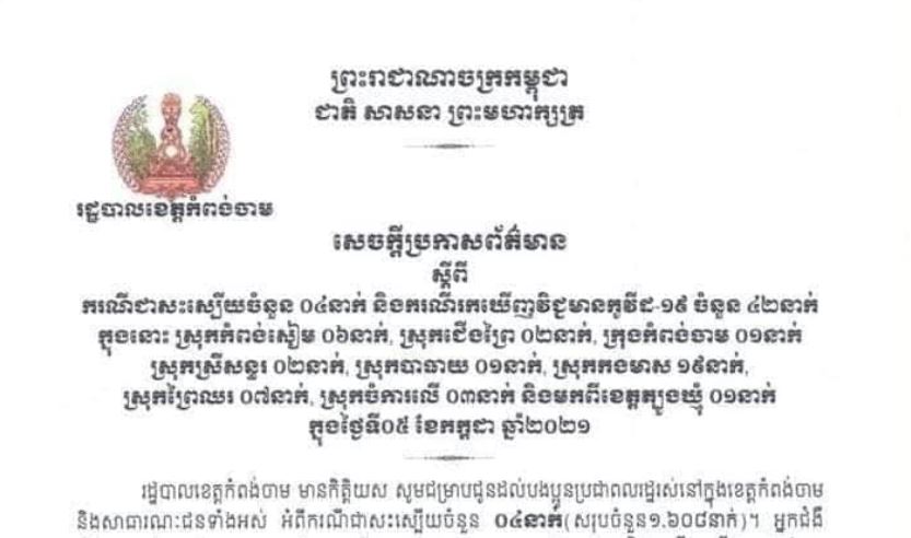 ខេត្តកំពង់ចាម រកឃើញអ្នកវិជ្ជមានជំងឺកូវីដ-១៩ ថ្មី ៤២នាក់ និងស្លាប់ ៥នាក់ ក្នុងរយៈពេល ២៤ម៉ោងចុង ក្រោយនេះ