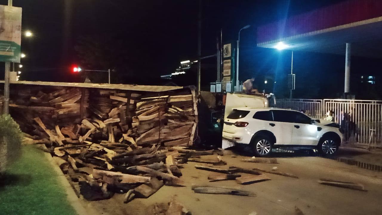 រថយន្តដឹកអុសបើកគេចពីរថយន្តមួយគ្រឿងជាន់ហ្វ្រាំងបង្ខំរេចង្កូតក្រឡាប់ និងបុករថយន្តមួយទៀត បណ្តាលបុរសម្នាក់របួសបាក់ជើងម្ខាង