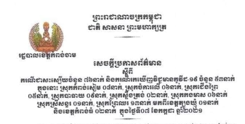 យោងតាមរដ្ឋបាលខេត្ត អ្នកឆ្លងថ្មីទាំងនោះ គឺនៅស្រុកកំពង់សៀម៨នាក់, ស្រុកចំការលើ៦នាក់, ស្រុកជើងព្រៃ៥នាក់, ស្រុកបាធាយ៩នាក់, ស្រុកស្ទឹងត្រង់២នាក់, ស្រុកកងមាស៦នាក់, ស្រុកស្រីសន្ធរម្នាក់ ស្រុកព្រៃឈរ១៣នាក់ មកពីខេត្តត្បូងឃ្មុំម្នាក់ និងមកពីខេត្តកំពង់ធំ២នាក់។ ជាមួយគ្នានោះ ខេត្តកំពង់ចាមបានជូនដំណឹងថា នៅថ្ងៃទី៧កក្កដា មានអ្នកជំងឺកូវីដ១៩ចំនួន៧៦នាក់បានជាសះស្បើយ។ ចំណែកអ្នកស្លាប់ទាំង២នាក់ គឺទី១ ស្ត្រីអាយុ៧៨ឆ្នាំ នៅភូមិប៉ែន ឃុំទ្រាន ស្រុកកំពង់សៀម និង ទី២ បុរសអាយុ៤៤ឆ្នាំ នៅភូមិក្រសាំងពុក ឃុំមៀន ស្រុកព្រៃឈរ ខេត្តកំពង់ចាម។