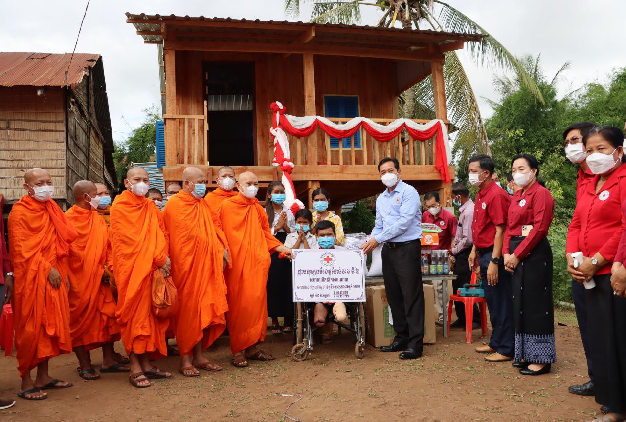 ឯកឧត្តម អ៊ុន ចាន់ដា ប្រធានអភិបាល នៃគណៈអភិបាលខេត្តកំពង់ចាម និងជាគណៈកម្មាធិការសាខាកាកបាទក្រហមខេត្ត និមន្ត និងអមដំណើរដោយ ព្រះវត្តមានព្រះសីលសំវរ ប៊ត តាំងឆេង ព្រះនាគមុនីមេគណខេត្តកំពង់ចាម និងព្រះមន្រ្តីសង្ឃជាច្រើនអង្គ ព្រមទាំងឯកឧត្តម លោកជំទាវ អភិបាលរងខេត្ត ថ្នាក់ដឹកនាំមន្ទីរអង្គភាពជុំវិញខេត្ត បាននិមន្ត និងអញ្ជើញចុះប្រគល់ផ្ទះទី២ ជាកម្មវិធីផ្ទះមនុស្សធម៌ខេត្ត ក្រោមកិច្ចសហការរវាងសាខាកាកបាទក្រហមកម្ពុជា ខេត្ត និង សាលាគណខេត្ត ជូនដល់ជនមានពិការភាព ក្រលំបាកម្នាក់ ឈ្មោះ ឆែក ភ័ក្ត្រ អាយុ ៣១ឆ្នាំ រស់នៅ ភូមិព្រែកទក់ ឃុំខ្ពបតាងួន ស្រុកស្ទឹងត្រង់ នៅព្រឹកថ្ងៃទី៩ ខែកក្កដា ឆ្នាំ២០២១។