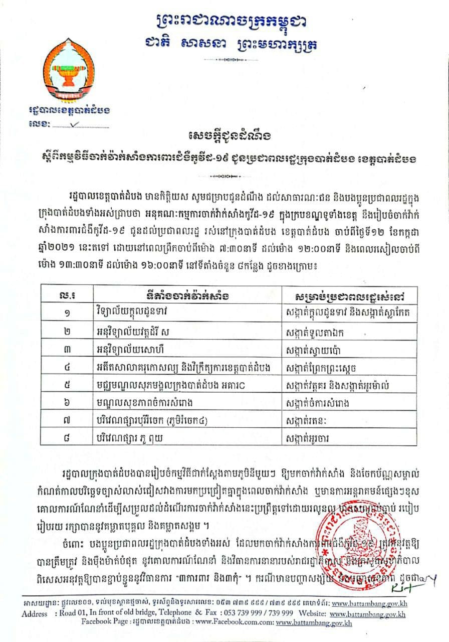 រដ្ឋបាលខេត្តបាត់ដំបង បានចេញនូវសេចក្តីជូនដំណឹងដល់ប្រជាពលរដ្ឋរស់នៅក្នុងសង្កាត់ទាំង១០នៃក្រុងបាត់ដំបងពាក់ព័ន្ធនិងទីតាំងដែលត្រូវផ្តល់និងចាក់វ៉ាក៎សាំងការពារជម្ងឺឆ្លងកូវីដ-19