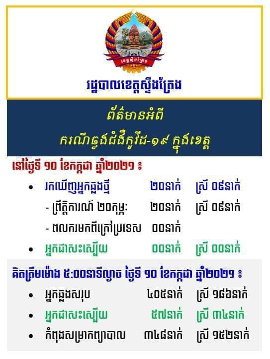អត្តសញ្ញាណអ្នកវិជ្ជមានកូវីដចំនួន ២០នាក់ នៅខេត្តស្ទឹងត្រែងOne-Minuteអត្ថបទដោយ៖AMS OneMinute ១០ កក្កដា ២០២១ AMS OneMinuteអត្ថបទមុនអត្ថបទបន្ទាប់