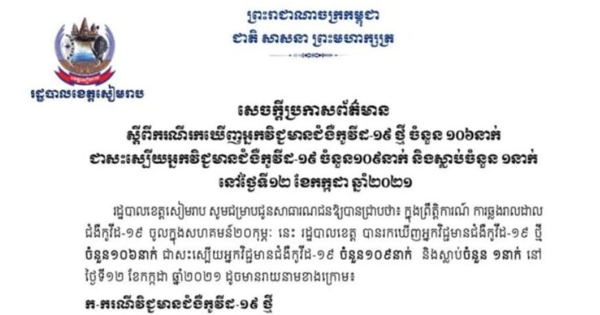 យោងតាមរដ្ឋបាលខេត្ត អ្នកឆ្លងថ្មីទាំងនោះ គឺរួមមានពលរដ្ឋក្នុងក្រុង សៀមរាប៦១នាក់, ស្រុកជីក្រែង១៧នាក់, ស្រុកប្រាសាទបាគង៣នាក់, ស្រុកសូទ្រនិគម១៥នាក់, ស្រុកពួក៣នាក់, ស្រុកអង្គរធំម្នាក់, មកពីខេត្តព្រៃវែងម្នាក់ និងឆ្លងលើពលករមកពីប្រ ទេសថៃចំនួន៥នាក់។ចំណែកអ្នកស្លាប់ជាបុរសអាយុ៤៩ឆ្នាំ អាសយដ្ឋានភូមិភ្លង់ ឃុំលាងដៃ ស្រុកអង្គរធំ ខេត្តសៀមរាប។ ខេត្តសៀមរាប មានអ្នកឆ្លងជំងឺកូវីដ-១៩សរុបចំនួន២ពាន់៥៥៣នាក់, ព្យាបាលជាសះ ស្បើយចំនួន៩២៧នាក់និងស្លាប់២៥នាក់។