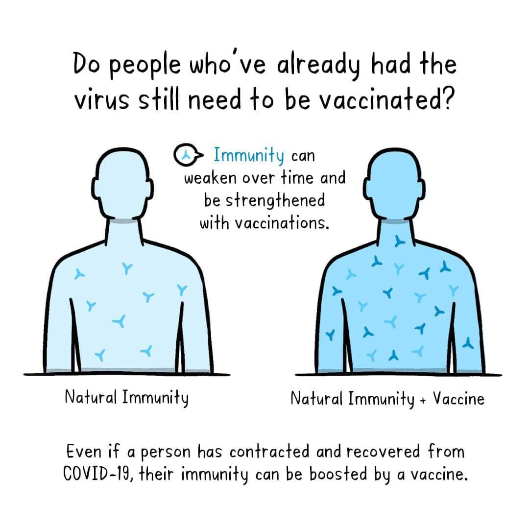 បើទោះបីជាបុគ្គលនោះធ្លាប់ឆ្លងកូវីដ១៩ ហើយត្រូវបានព្យាបាលជាសះស្បើយហើយក្តី ប្រព័ន្ធ ភាព ស៊ាំរបស់គេអាចអាចពង្រឹងឱ្យកាន់តែខ្លាំងបានដោយវ៉ាក់សាំង។