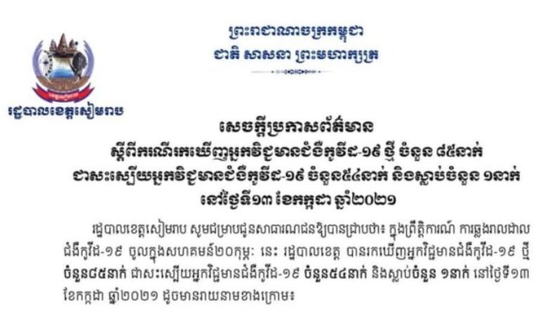 យោងតាមរដ្ឋបាលខេត្ត អ្នកឆ្លងថ្មីទាំងនោះ គឺរួមមានពលរដ្ឋក្នុងក្រុង សៀមរាប៧២នាក់, ស្រុកប្រាសាទបាគងម្នាក់, ស្រុកសូទ្រនិគម២នាក់, មកពីខេត្តបាត់ដំបងម្នាក់, មកពីខេត្តបន្ទាយមានជ័យម្នាក់, មកពីរាជធានីភ្នំពេញម្នាក់ និងឆ្លងលើពលករមកពីប្រ ទេសថៃចំនួន៧នាក់។ចំណែកអ្នកស្លាប់ជាស្ត្រីអាយុ៧៤ឆ្នាំ អាសយដ្ឋានភូមិដកពោធិ៍ សង្កាត់ស្លក្រាម ក្រុងសៀមរាប។ ខេត្តសៀមរាប មានអ្នកឆ្លងជំងឺកូវីដ-១៩សរុបចំនួន២ពាន់៦៣៩នាក់, ព្យាបាលជាសះ ស្បើយចំនួន៩៨១នាក់និងស្លាប់២៦នាក់។