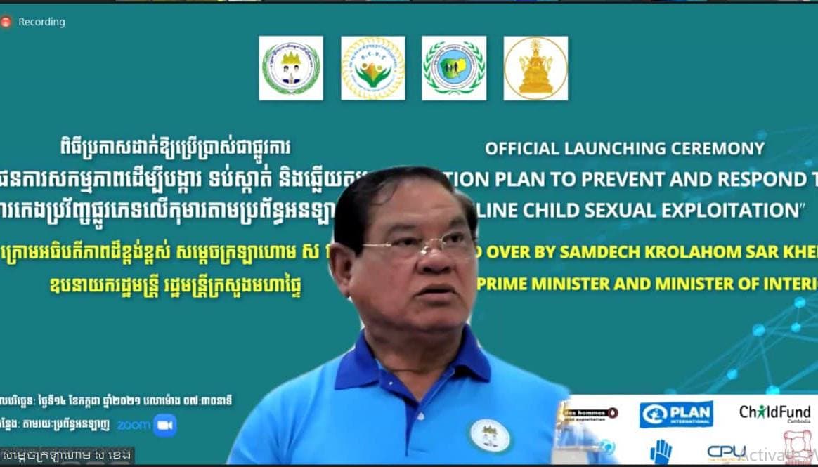 នាព្រឹកថ្ងៃពុធ ទី១៣ ខែកក្កដា ឆ្នាំ២០២១ តាមរយៈប្រព័ន្ធវីដេអូសន្និសីទ សម្តេចក្រឡាហោម ស ខេង ឧបនាយករដ្ឋមន្រ្តី រដ្ឋមន្រ្តីក្រសួងមហាផ្ទៃ និងជាប្រធានគណៈកម្មាធិការជាតិប្រឆាំងអំពើជួញដូរមនុស្ស អញ្ជើញជាអធិបតីភាពដ៏ខ្ពង់ខ្ពស់ ក្នុងពិធីប្រកាសជាផ្លូវការ ផែនការសកម្មភាពដើម្បីបង្ការ ទប់ស្កាត់ និងឆ្លើយតបការកេងប្រវ័ញ្ចផ្លូវភេទលើកុមារតាមប្រព័ន្ធអនឡាញ ឆ្នាំ២០២១-២០២៥ ដោយមានការចូលរួម ឯកឧត្តម វង សូត រដ្ឋមន្ដ្រីក្រសួងសង្គមកិច្ច អតីតយុទ្ធជន និងយុវនីតិ សម្បទា និងជាប្រធាន ក្រុមប្រឹក្សាជាតិកម្ពុជាដើម្បីកុមារ (ក.ជ.ក) ក្រសួងស្ថាប័នពាក់ព័ន្ធ ឯកអគ្គរដ្ឋទូត ឯកអគ្គរាជទូត ប្រចាំនៅព្រះរាជាណាចក្រកម្ពុជា សមាជិក សមាជិកាក.ជ.ក អគ្គស្នងការដ្ឋាននគរបាលជាតិ អភិបាល នៃគណៈអភិបា លរាជធានី-ខេត្ត និងតំណាងអង្កការដៃគូអភិវឌ្ឍន៍ពាក់ព័ន្ធមួយចំនួនទៀត។