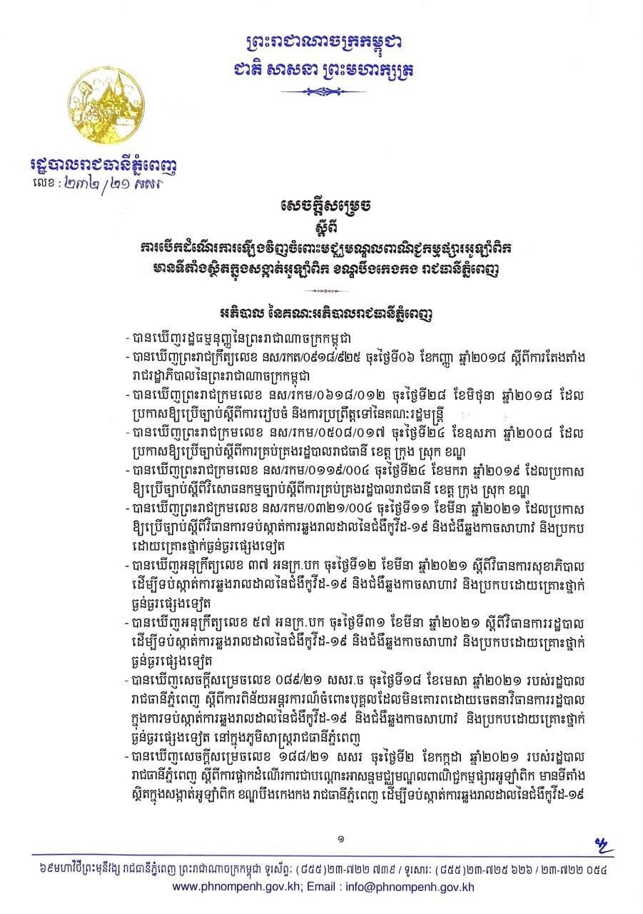 សេចក្តីសម្រេចស្តីពីការបើកដំណើរការឡើងវិញចំពោះមជ្ឈមណ្ឌលពាណិជ្ជកម្មផ្សារអូឡាំពិកមានទីតាំងស្ថិតក្នុងសង្កាត់អូឡាំពិក ខណ្ឌបឹងកេងកង រាជធានីភ្នំពេញ