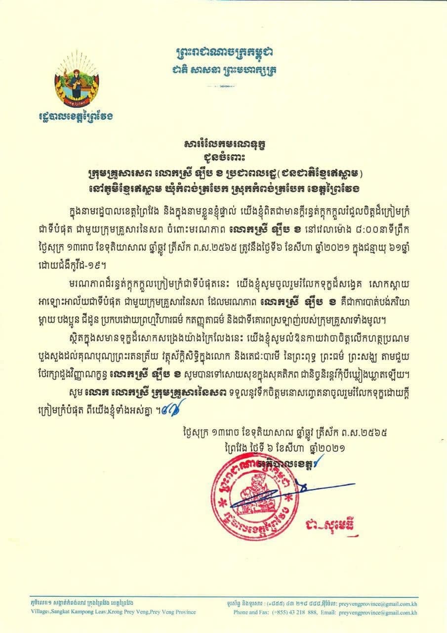 ខេត្តព្រៃវែងបានរកឃើញអ្នកឆ្លងជំងឺកូវីដ-១៩ថ្មីចំនួន៦១នាក់និងស្លាប់ម្នាក់ក្នុងរយៈពេល២៤ម៉ោងចុងក្រោយ