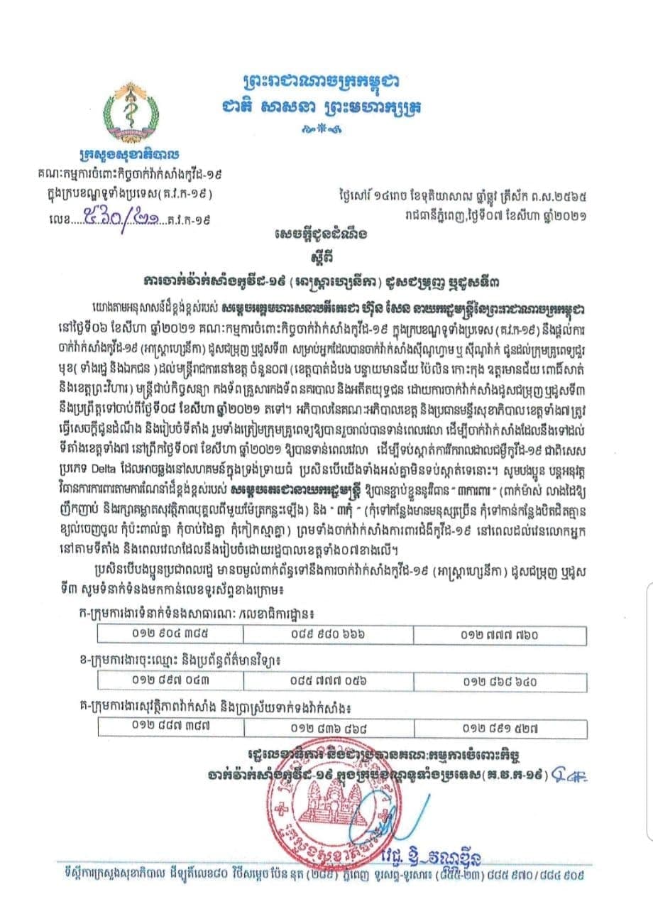 ក្រសួងសុខាភិបាល ចេញសេចក្ដីជូនដំណឹង ដោយសម្រេចចាប់ផ្តើមចាក់វ៉ាក់សាំងដូសទី៣ ឬដូសជំរុញ AstraZeneca ចាប់ពីថ្ងៃទី៨ ខែសីហា ឆ្នាំ២០២១តទៅ