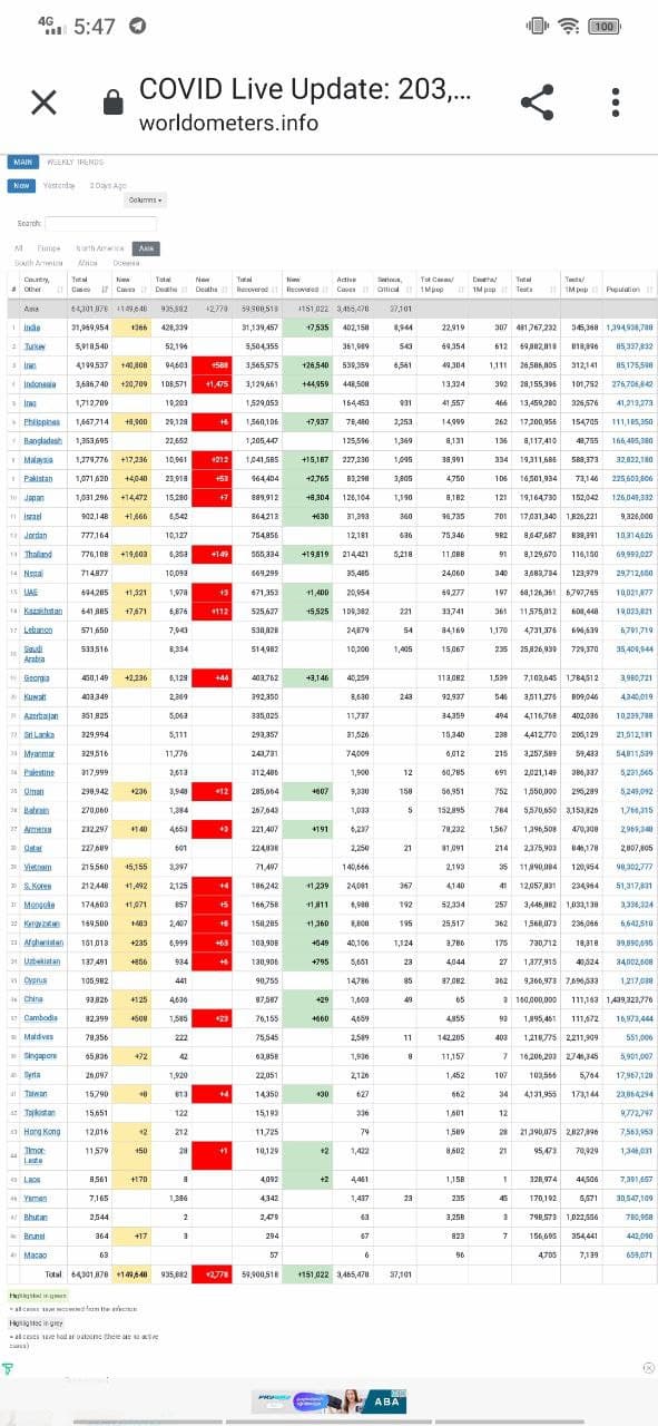 បើគិតសារុបនៅលើសាកលលោកនោះវិញការឆ្លងវីរុសកូវីដ១៩សារុបមានចំនួនជាង ២០៤លានករណី, និងការស្លាប់មានជាង៤លាន៣២ម៉ឺននាក់។