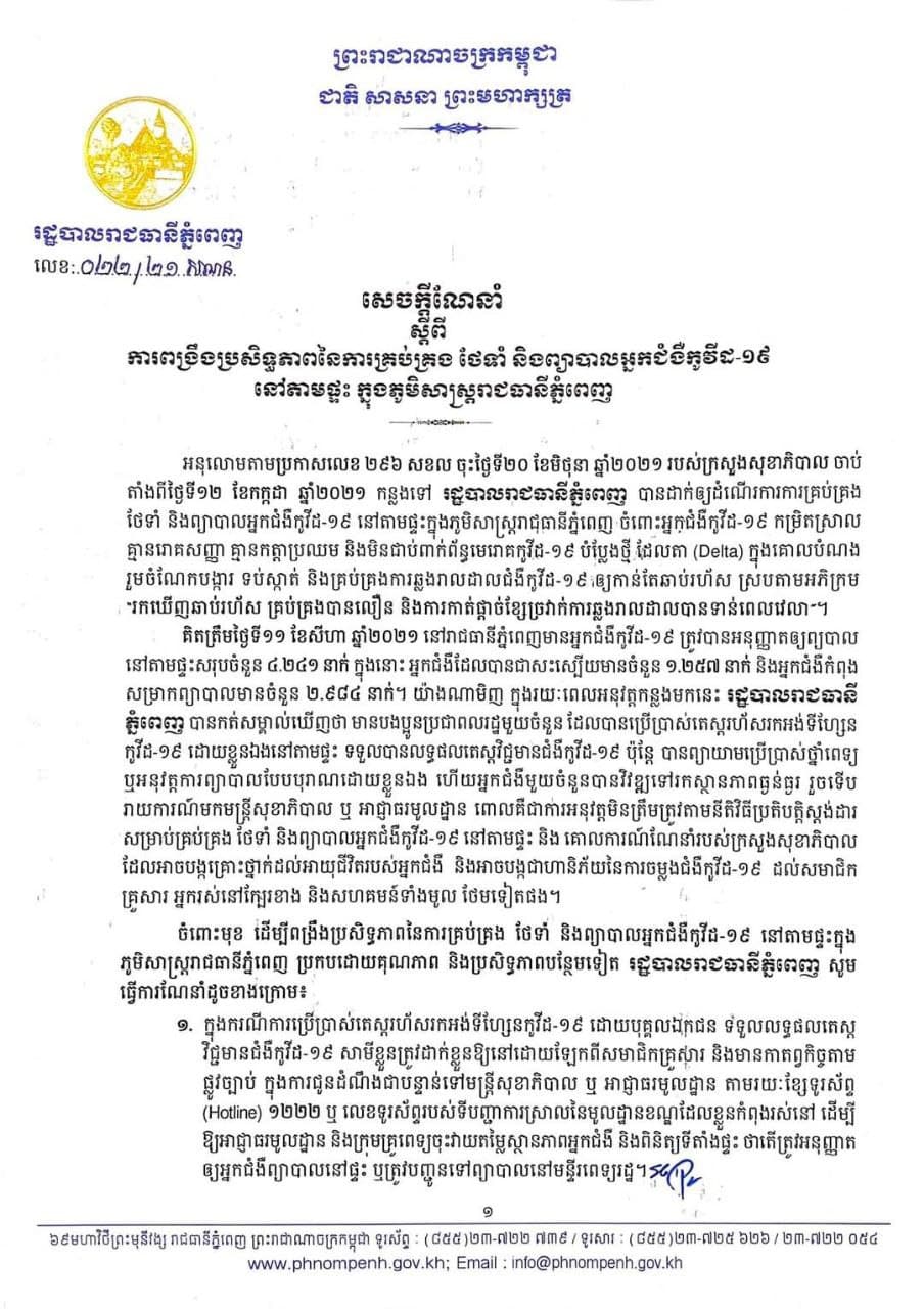 រដ្ឋបាលរាជធានីភ្នំពេញ បានបញ្ជាក់ថា ដើម្បីពង្រឹងប្រសិទ្ធភាពនៃការគ្រប់គ្រង ថែទាំ និងព្យាបាលអ្នកជំងឺកូវីដ-១៩ នៅតាមផ្ទះក្នុង ភូមិសាស្ត្ររាជធានីភ្នំពេញ ប្រកបដោយគុណភាព និងប្រសិទ្ធភាពបន្ថែមទៀត រដ្ឋបាលរាជធានីភ្នំពេញ សូមធ្វើការណែនាំដូចខាងក្រោម៖