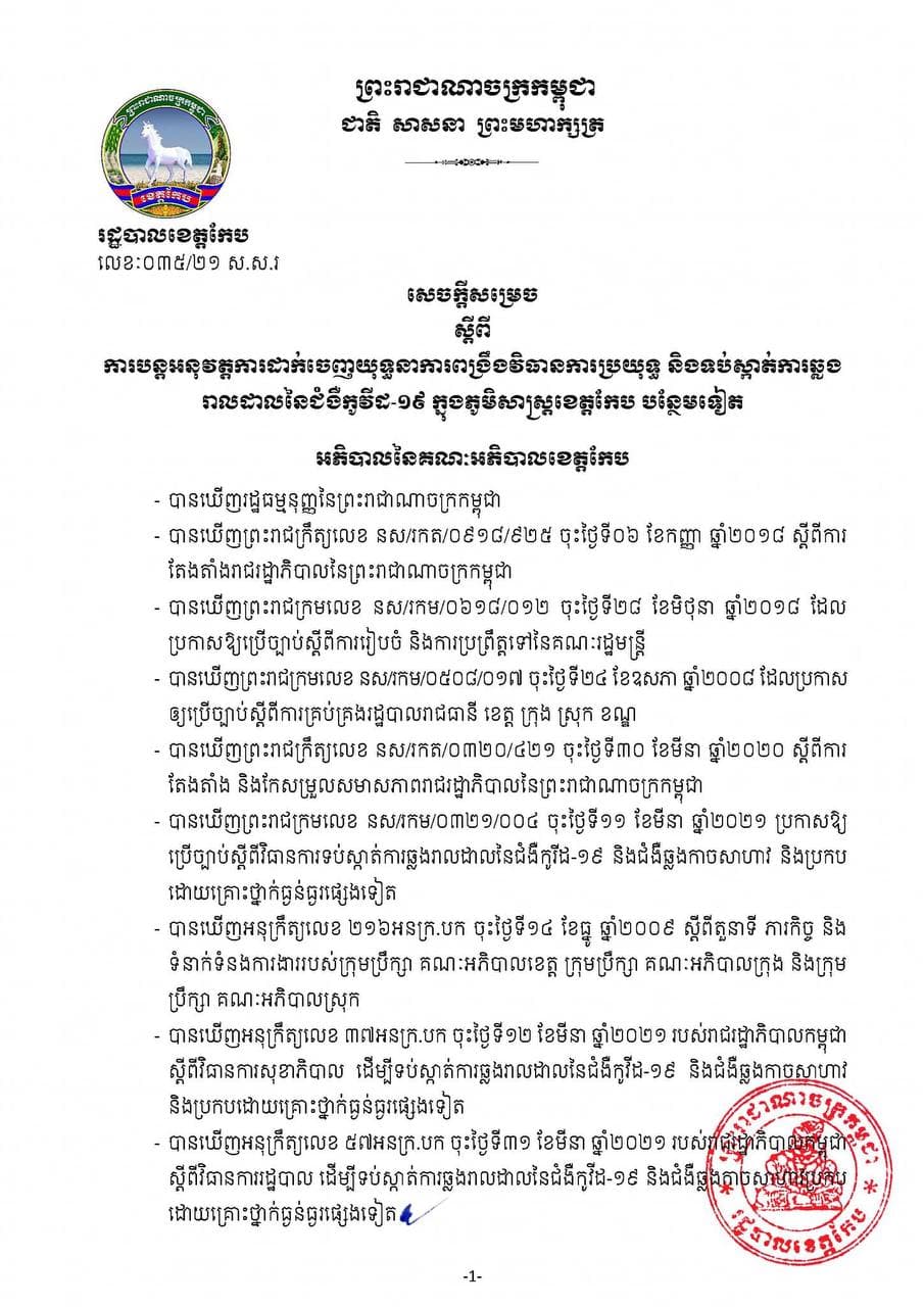 សេចក្ដីសម្រេច ស្ដីពីការបន្តអនុវត្តការដាក់ចេញយុទ្ធនាការពង្រឹងវិធានការប្រយុទ្ធ និងទប់ស្កាត់ការឆ្លងរាលដាលនៃជំងឺកូវីដ-១៩ ក្នុងភូមិសាស្ត្រខេត្តកែប បន្ថែមទៀត !