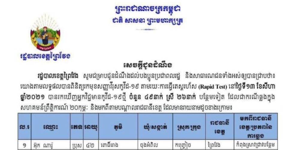 ខេត្តព្រៃវែង បានរកឃើញអ្នកឆ្លងជំងឺកូវីដ-១៩ថ្មីចំនួន ៤៩នាក់និងជាសះស្បើយ ១០៦នាក់ ក្នុងរយៈពេល ២៤ម៉ោងចុងក្រោយ