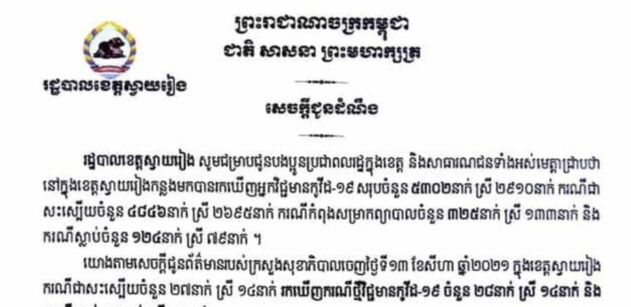 ខេត្តស្វាយរៀង បានរកឃើញអ្នកឆ្លងជំងឺកូវីដ-១៩ថ្មីចំនួន ២៨នាក់ និងស្លាប់ ២នាក់ក្នុងរយៈពេល ២៤ម៉ោងចុងក្រោយ