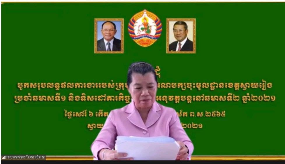 ស្វាយរៀង៖ លោកជំទាវកិត្តិសង្គហបណ្ឌិត ម៉ែន សំអន សមាជិកាគណៈអចិន្ត្រៃយ៍ គណៈកម្មាធិការកណ្ដាល ប្រធានក្រុមការងារគណបក្ស ចុះមូលដ្ឋានខេត្តស្វាយរៀង ថ្លែងក្នុងពិធីបិទកិច្ចប្រជុំបូកសរុប លទ្ធផលនៃការអនុវត្តភារកិច្ចរបស់ក្រុមការងារគណបក្ស ចុះជួយខេត្តស្វាយរៀងប្រចាំឆមាសទី១ ឆ្នាំ២០២១ និងទិសដៅអនុវត្តភារកិច្ចសំខាន់ៗ សម្រាប់អនុវត្តឆមាសទី២ ឆ្នាំ២០២១ នាព្រឹកថ្ងៃសៅរ៍ ៦ កើត ខែស្រាពណ៍ ឆ្នាំ ឆ្លូវ ត្រីស័ក ព.ស ២៥៦៥ ត្រូវនឹងថ្ងៃទី ១៤ ខែសីហា ឆ្នាំ ២០២១ នៅមន្ទីរគណបក្សខេត្តស្វាយរៀង ។