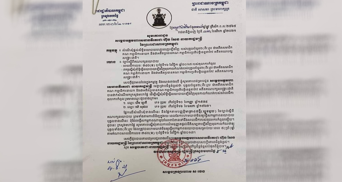 ភ្នំពេញៈ សម្តេចនាយករដ្ឋមន្ត្រី ហ៊ុន សែន បានយល់តាមសំណើរបស់សម្តេចក្រឡាហោម ស ខេង ឧបនាយករដ្ឋមន្ត្រី រដ្ឋមន្ត្រីក្រសួងមហាផ្ទៃ ក្នុងការផ្តល់សិទ្ធិនយោបាយឡើងវិញដល់មន្ត្រីជាន់ខ្ពស់អតីតគណបក្សសង្គ្រោះជាតិ ចំនួនពីររូប។ ការយល់ព្រមរបស់សម្តេចតេជោ ហ៊ុន សែន បានធ្វើឡើងនៅថ្ងៃទី១៤ ខែសីហា ឆ្នាំ២០២១ នេះ។