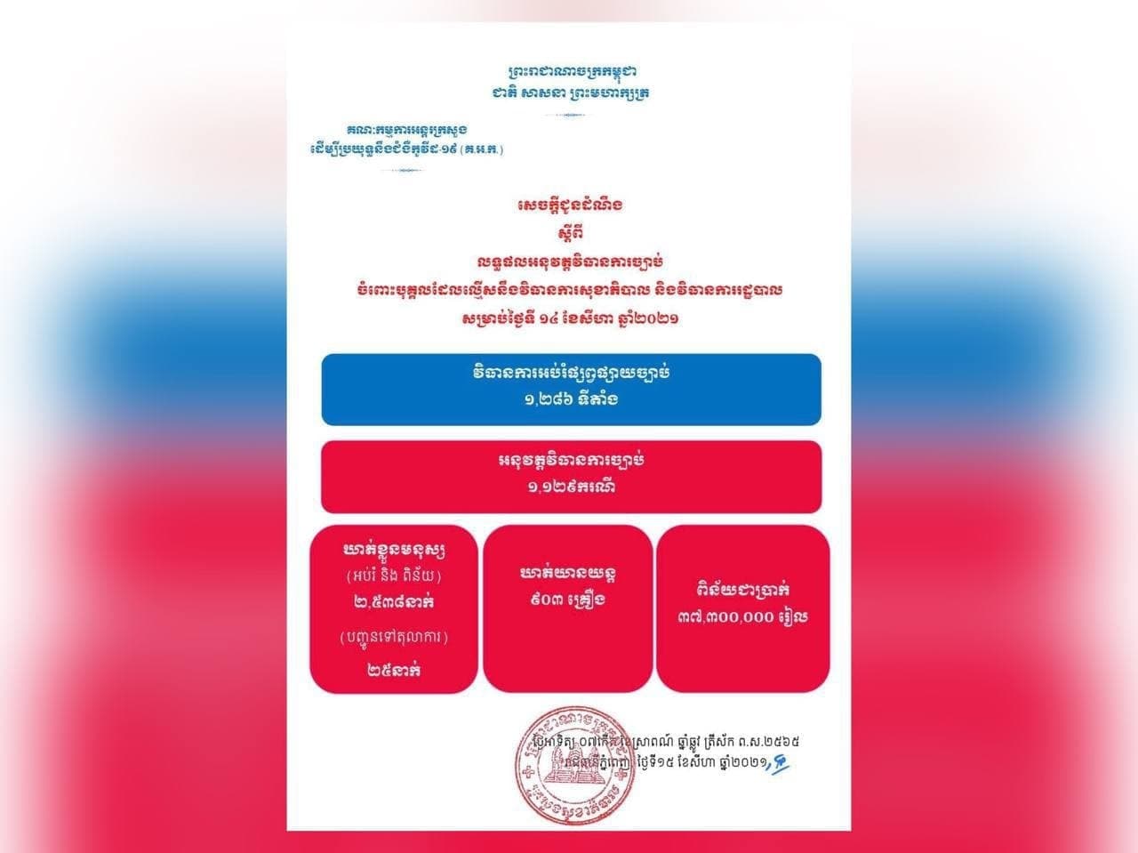 សមត្ថកិច្ចជំនាញ នៅថ្ងៃទី១៤ ខែសីហា ឆ្នាំ២០២១ បានរកឃើញមនុស្ស ២,៥៣៨នាក់ទៀត និងយានយន្តចំនួន ៩០៣ គ្រឿង បានប្រព្រឹត្តល្មើសនឹងវិធានការសុខាភិបាល និងវិធានការរដ្ឋបាល សរុប ១១២៩ ករណី។ សមត្ថកិច្ច បានធ្វើការផាកពិន័យជាទឹកប្រាក់សរុបចំនួន ៣៧.៣លានរៀលផងដែរ។ ក្នុងចំណោមអ្នកដែលបានល្មើសវិធានការទាំងនេះ មានមនុស្ស ២៥នាក់ ត្រូវបានសមត្ថកិច្ចបញ្ជូនទៅតុលាការ។